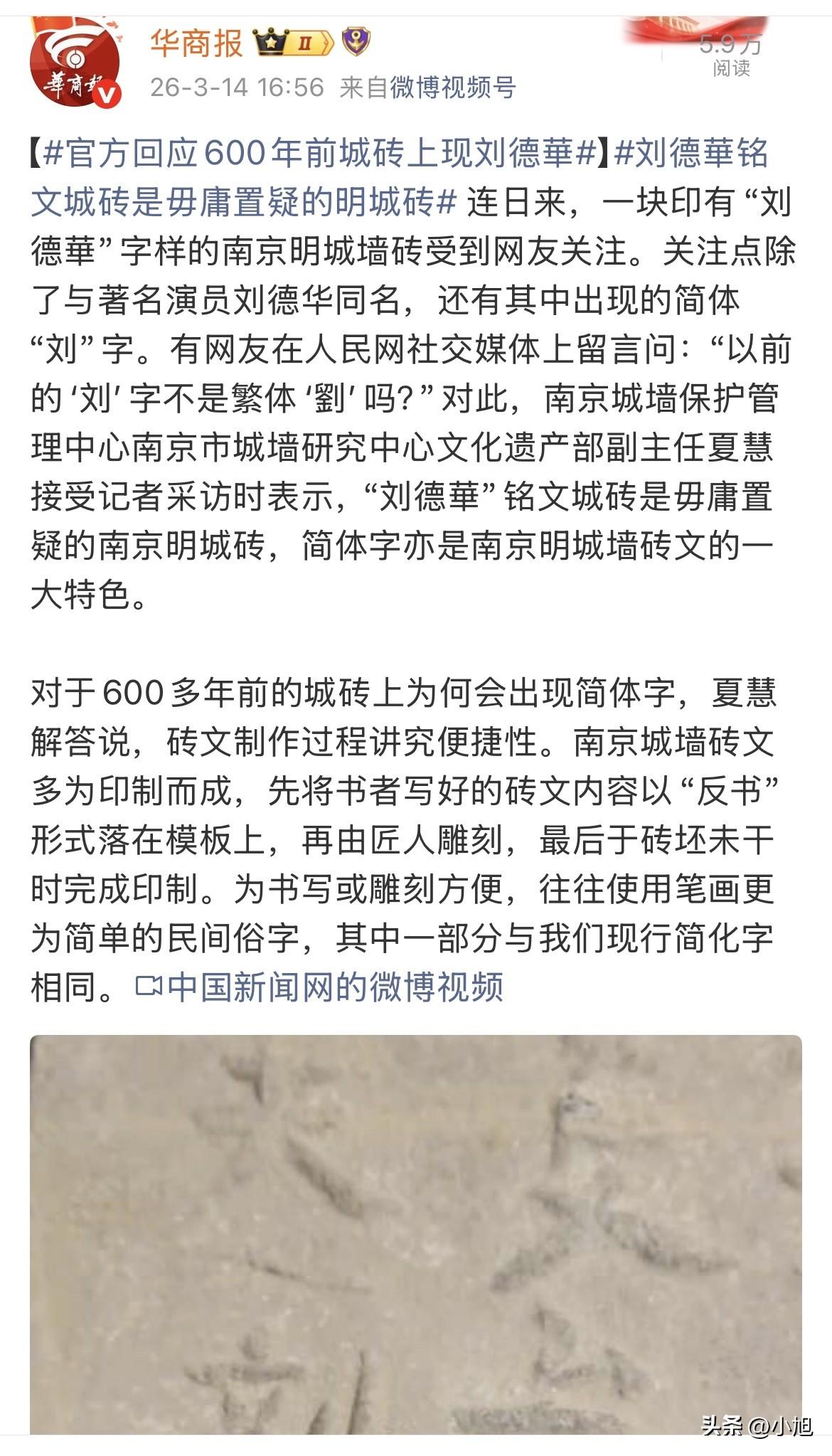 南京城墙博物馆里,有一块砖,这半个月被人围得水泄不通。不是因为砖有多大,也不是因为砖上的字刻得多漂亮。就因为三个字——刘德華。 有人举着手机拍了又拍,发朋友圈说“华仔穿越了,跑到明朝去烧砖”。也有人盯着那个简体“刘”字不撒眼,当场就杠上了:六百年前的东西,怎么可能用简体字?那时候的“刘”不都是繁体的“劉”吗?怕不是哪个追星的在后人刻上去的吧? 这个质疑,把这块砖从网红推到了风口浪尖。 博物馆的工作人员被问得多了,只好把专家请出来。南京城墙保护管理中心文化遗产部副主任夏慧,站在展柜前,指着这块砖说,别急,咱们从头看。 砖上的铭文清清楚楚写着:捴甲黄原亨、甲首刘德華、小甲簡囗囗、窑匠晏文叁、造磚人夫刘德華。什么叫甲首?相当于现在的村民小组长。什么叫造砖人夫?就是亲自下窑踩泥、脱坯烧砖的苦力工。这块砖上,刘德華的名字出现了两次——一次是甲首,一次是人夫。 专家推测,当年可能是人手不够,这位刘组长白天带着乡亲们干活,晚上自己还得脱了鞋踩泥,一个人干两个人的活。 根据砖另一侧的督造官吏铭文,这个刘德華是明初江西瑞州府上高县的人,也就是今天的江西宜春上高县。六百多年前,那个地方确实有个叫刘德華的人,带着一帮乡亲烧砖。 但真正让网友吵翻天的,是那个简体“刘”字。 夏慧说,咱们得搞清楚一件事——简体字不是1949年以后才凭空造出来的。魏晋南北朝的时候,除了官方用的正体字,民间早就流行各种笔画简单的俗体字。隋唐时期俗体字越来越多,宋元以后更是遍地都是。新中国成立后推行简化字,其实就是把这些在民间流传了上千年的简写俗字收集起来,整理规范,变成今天的标准汉字。 所以,这个“刘”字,明朝初年的老百姓早就这么写了。 还有一个关键原因——砖文的制作过程,讲究的是便捷。 夏慧解释,南京城墙的砖文,大部分不是刻上去的,是印上去的。先由书吏把砖文内容用“反书”的形式写在模板上,匠人照着雕刻,然后在砖坯还没干的时候印上去。这个过程里,不管是写反书的人,还是刻模板的匠人,都图个省事。笔画越简单越好,怎么顺手怎么来。繁体的“劉”,一共15画;简体的“刘”,6画。换你是那个天天刻模板的匠人,你选哪个? 更让人意外的是,元末明初那会儿,朝廷对砖文的字体、版式压根没什么严格要求,甚至不要求避讳。洪武元年的城砖上,“元”字就那么明晃晃刻着,也没人说要避朱元璋的名讳。当时的环境,比咱们想象的要宽松得多。 研究人员翻遍了南京城墙的砖文,发现这样的俗字不是个例。目前已发现300多个俗字,包括简体字、异体字,跟咱们今天用的简化字一样的,除了“刘”,还有“时”“万”“庐”“宝”等30多个。涉及人名、地名、官职、身份,五花八门。 这300多个字,像300多个钉子,把那个时代钉在了砖上。 有意思的是,这样的“刘德華”砖,南京城里不止一块。 研究员王腾沿着现存25公里的明城墙,一块砖一块砖地摸过去。中华门,5块;神策门到太平门,4块;仪凤门到挹江门,5块;午朝门遗址,还有1块。零零总总算下来,至少16块。 也就是说,六百多年前,江西上高县那个叫刘德華的人,带着一帮乡亲,一窑一窑地烧砖。烧好的砖装船,顺着长江运到南京,一块一块砌进城墙里。从中华门到神策门,从仪凤门到午朝门,到处都有他的名字。 他不是一个人。他是无数个被“物勒工名”制度绑在砖上的名字之一。 什么叫“物勒工名”?就是每一块砖上都要刻着负责人的名字,从府县官吏到窑匠夫役,一级一级排下来。砖出了问题,顺着人名就能找到人。该砍头砍头,该充军充军,跑都跑不掉。这是朱元璋想出来的办法。他要修一座永不陷落的城墙,就必须让每一块砖都有人负责。 于是,近百万工匠,历时28年,烧了3.5亿块城砖。每一块砖上都刻着名字。那些名字里,有当官的,有管事的,但更多的是刘德華这样的普通人。他们大多不识字,也不会写自己的名字。但他们的名字,就这样被刻在砖上,砌进墙里,一砌就是六百多年。 如今,这块砖成了网红。它的照片被拍下来,发到网上,被无数人围观、讨论、质疑。 有人说,这不就是巧合吗?一个普通人的名字碰巧跟明星一样,有什么好大惊小怪的。 也有人说,那个简体字就是疑点,六百年前的东西怎么可能用简体。 但真正懂行的人知道,这块砖的价值,恰恰在于那个被人质疑的“刘”字。它告诉咱们一件事:汉字不是某一天突然变简单的。它是一点一点,在无数普通人的手底下,为了省事、为了顺手,慢慢演化过来的。 那些刻砖的匠人,不会想到自己随手写的俗字,六百年后会被人拿来当证据,质疑这块砖的真假。他们只是想着,少刻几刀,早点收工。 他大概不会想到,六百多年后,有人会站在博物馆里,隔着玻璃看他烧的那块砖。 你以为繁体字才是正统,其实老百姓早就用上了简体。 来源:华商报