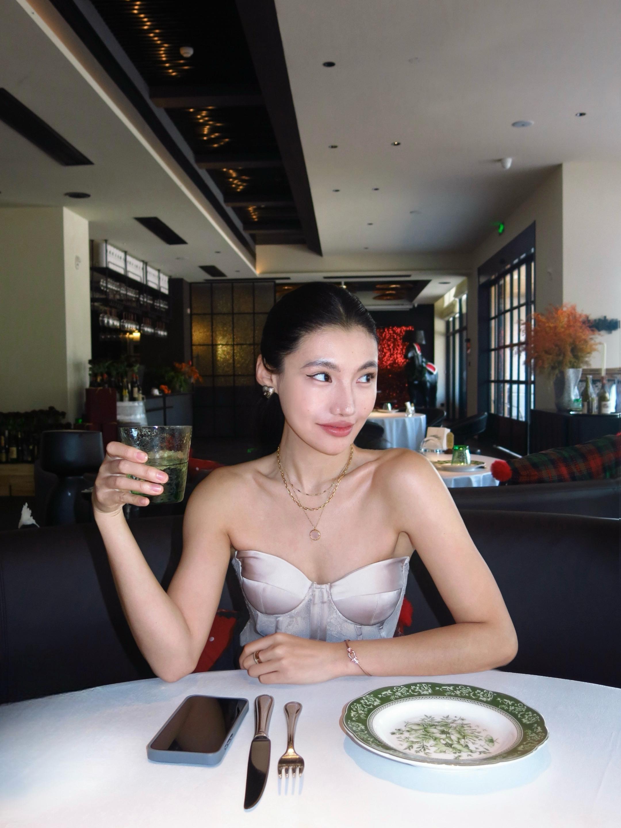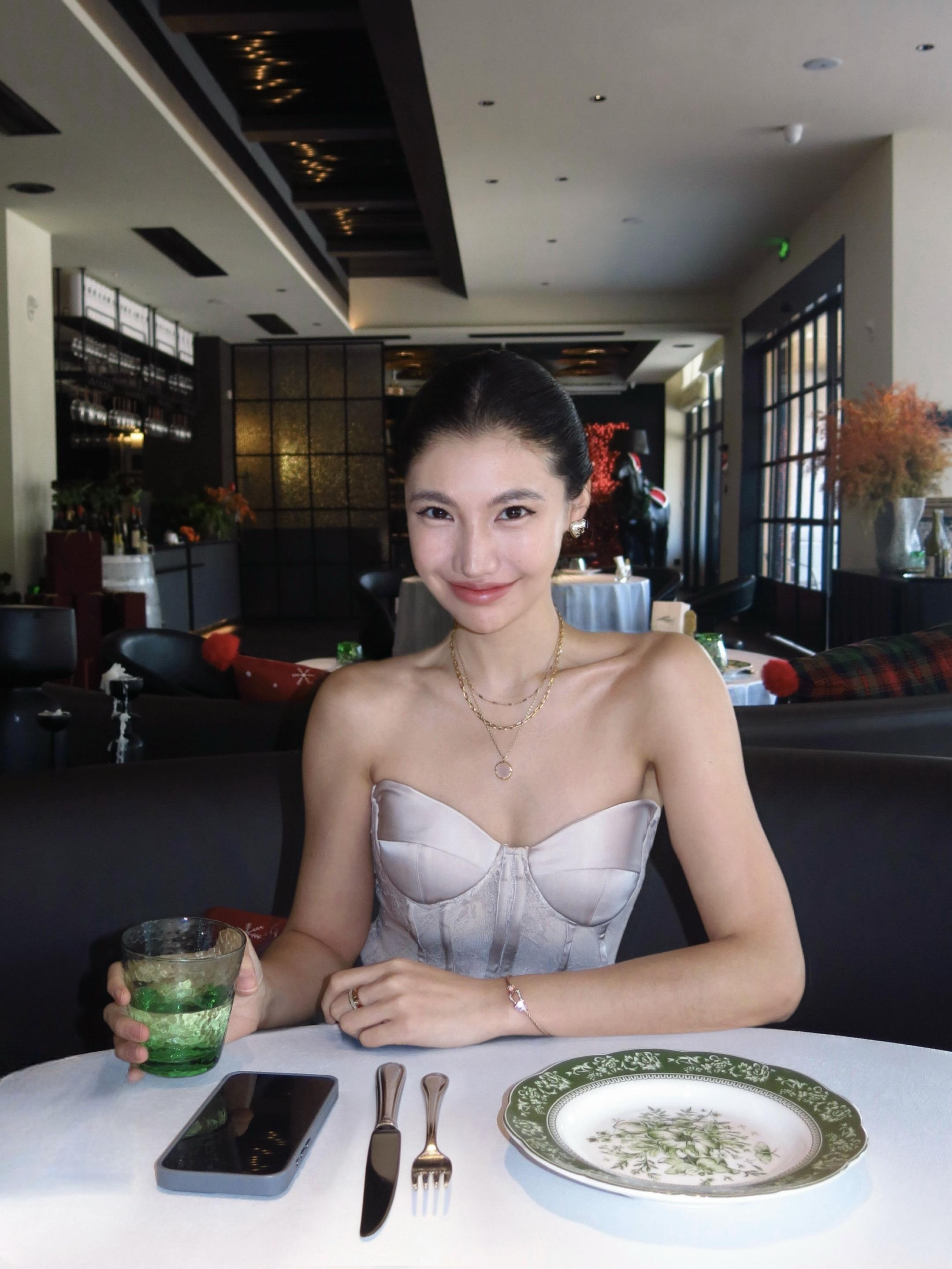 裸色斜肩裙,真的是清爽又不费力的好看。突然很想试试不靠多余装饰、只靠剪裁说