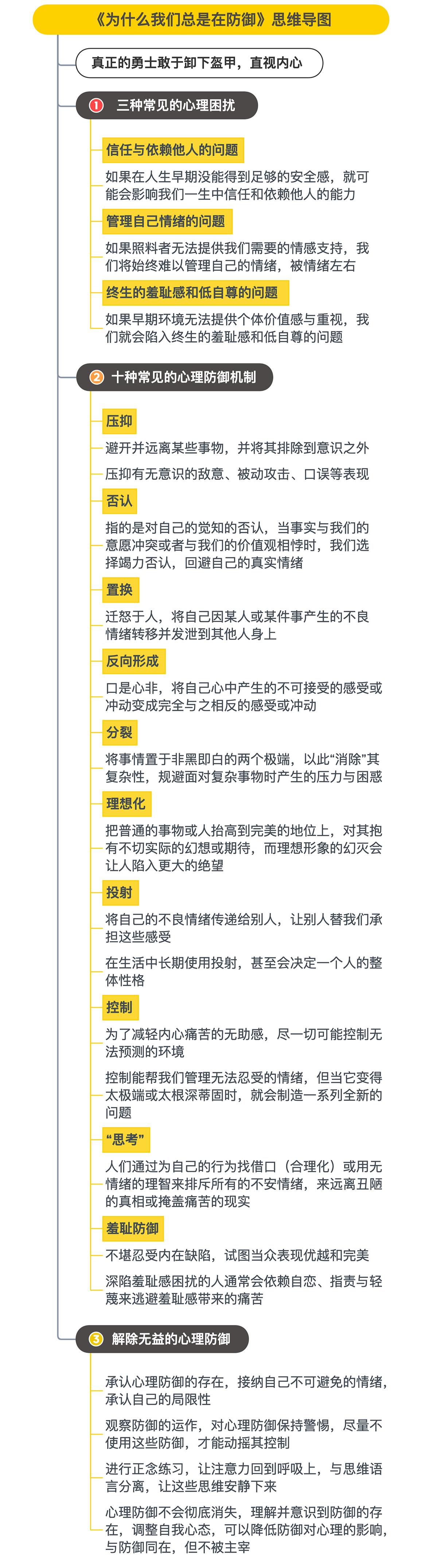 认知提升连载8:《为什么我们总在防御》这本书解决我们三个问题,①信任与依赖他人的问题,②管理自己情绪的问题,③终生的羞耻感和低自尊的问题。这是这本书的思维导图。自我认同困境 自我认知心理学 自我认知陷阱 自我价值迷思 自我救赎学 自我驱动哲学 自我认知危机
