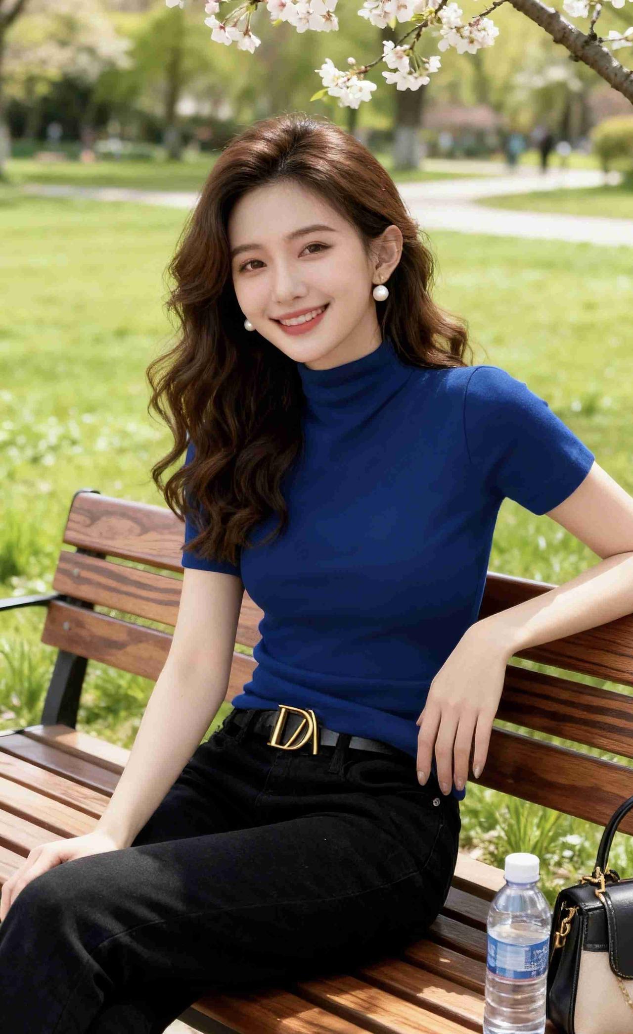 我的今日状态:😁轻松愉快 我这里的天气:☀️晴天 《樱下闲坐》 樱瓣轻落,吻过发梢的卷 宝蓝裹着暖阳,衬得眉眼清甜 珍珠耳坠摇落细碎的光 把春风的温柔,都藏在颈间 木椅承住片刻慵懒 黑裤垂落,衬得身姿舒展 D形扣带系着从容的闲 指尖轻搭,漫过时光的缓 草色漫向远处的云边 风携着花香,拂过眉弯 不追喧嚣,不问流年 只在这春日里,静享安然