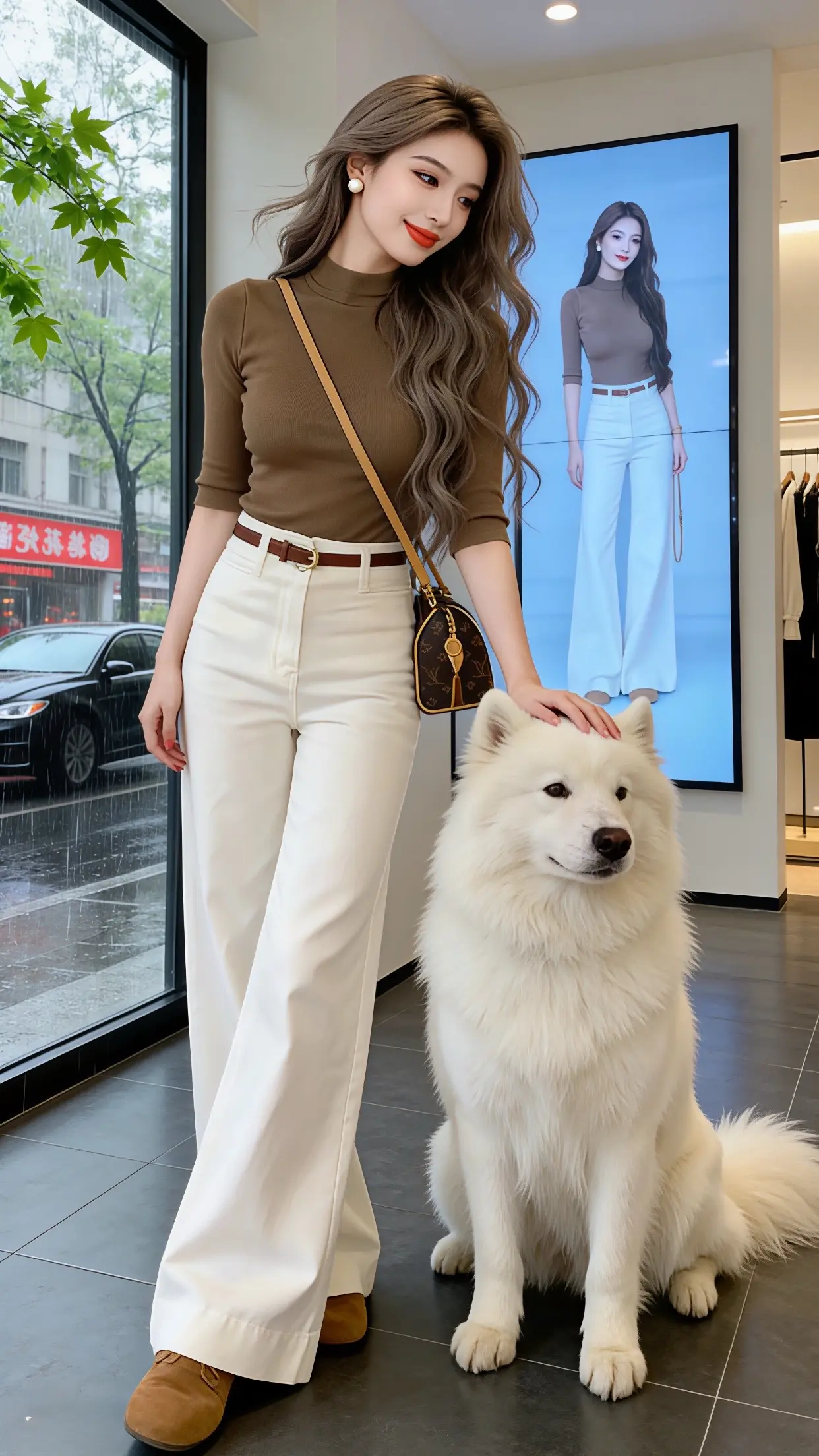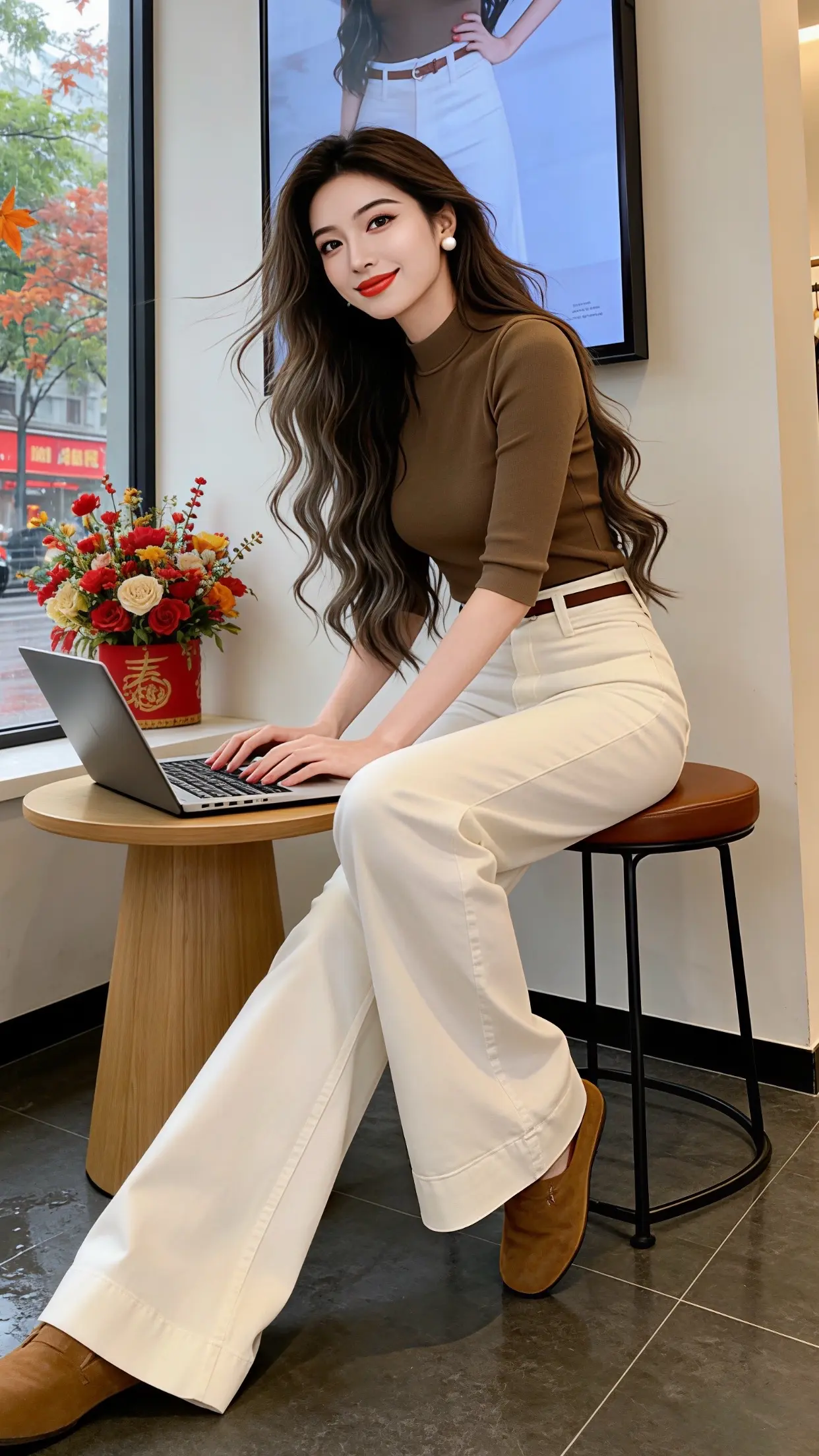 山间少女,紫色高领衫与白色牛仔裤的完美搭配,尽显自然与时尚。