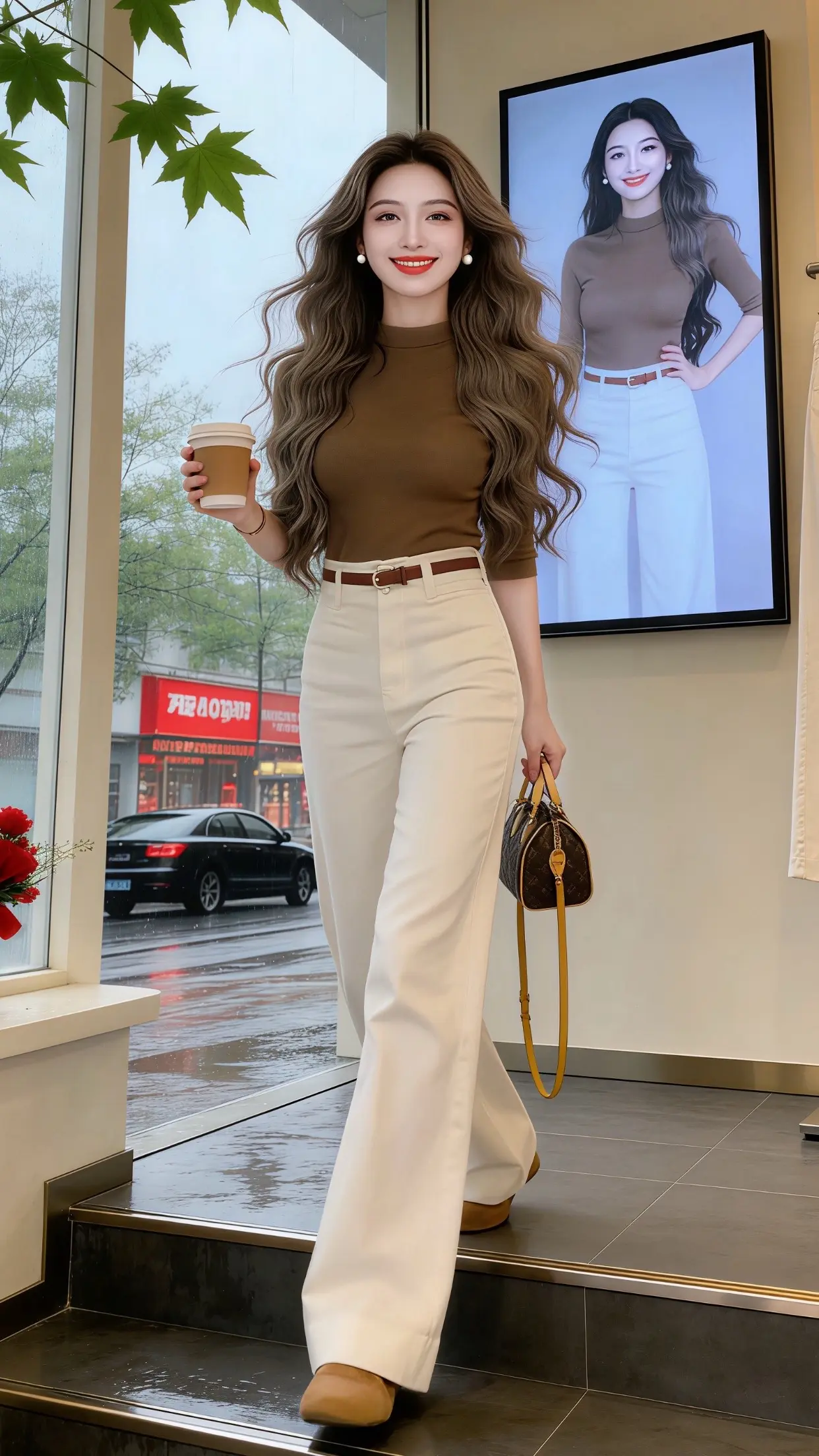 美女穿着牛仔裤,手拿小包走路。