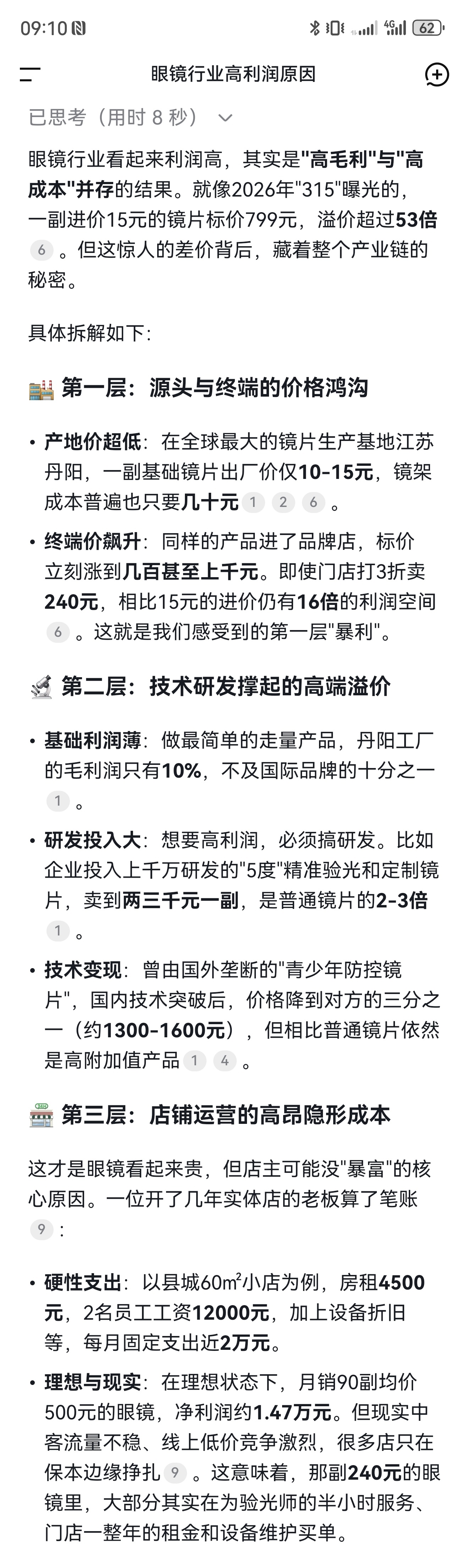 早上我又想了想眼镜确实利润不低但可能不像想象中那么赚钱也许是高毛利与高成本并存的