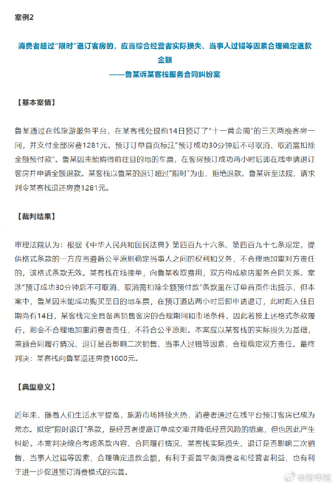 实践中,在线预订模式形态日益普遍。例如,消费者在出游前的较早时间就预订客房,但因行程受阻等原因需要取消预订时,有时面临较为严苛的取消条件。“鲁某诉某客栈服务合同纠纷案”中,对于消费者在预订成功后较短时间内即取消预订的情况,人民法院认定“预订成功30分钟后不可取消、取消需扣除全额预付款”合同条款不合理加重消费者责任,并综合考量客栈实际损失、合同履行情况、退订是否影响二次销售、当事人过错等因素,合理确定退费金额,公平保护消费者权益和经营者利益,有利于促进在线预订模式的持续完善和优化。