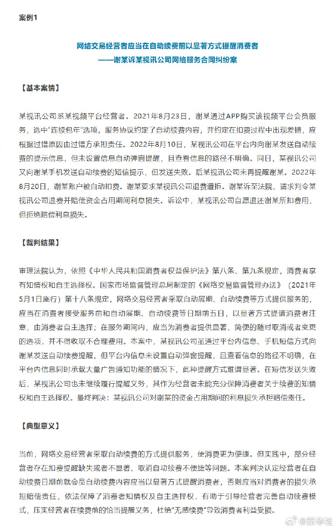 #315# #消费者权益保护典型案例发布#【最高法发布6个消费者权益保护典型案例】#视频会员自动续费未显著提醒维权成功# 最高人民法院3月15日发布6个消费者权益保护典型案例,集中展现人民法院护航消费、服务民生、促进发展的生动实践。