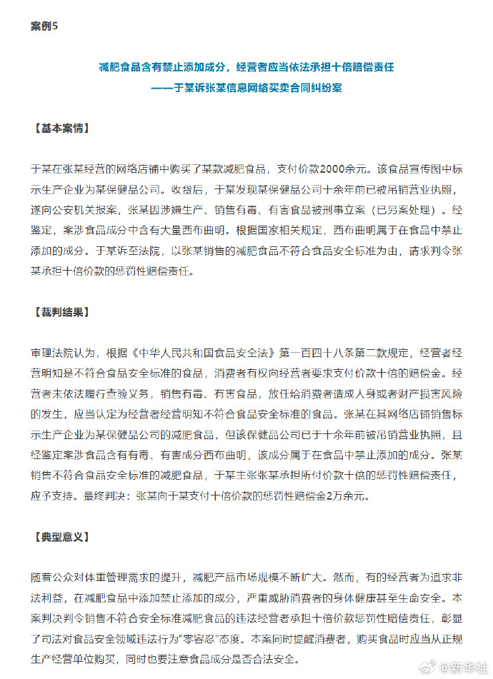 “于某诉张某信息网络买卖合同纠纷案”中,经营者为追求非法利益,在减肥食品中添加有毒有害成分,严重威胁消费者身体健康。人民法院依法支持消费者十倍赔偿请求,彰显对食品安全违法行为“零容忍”态度,有力震慑不法行为。