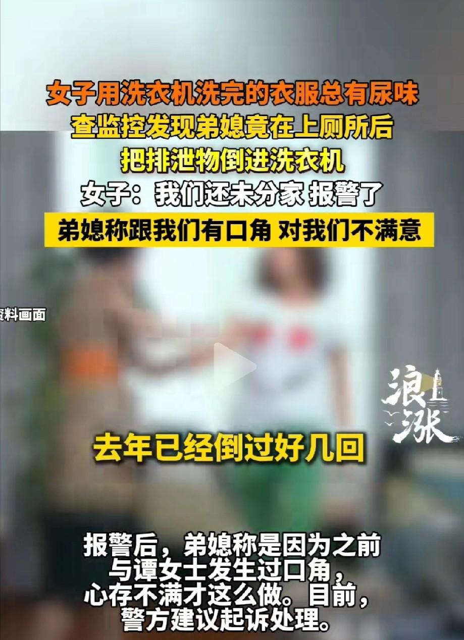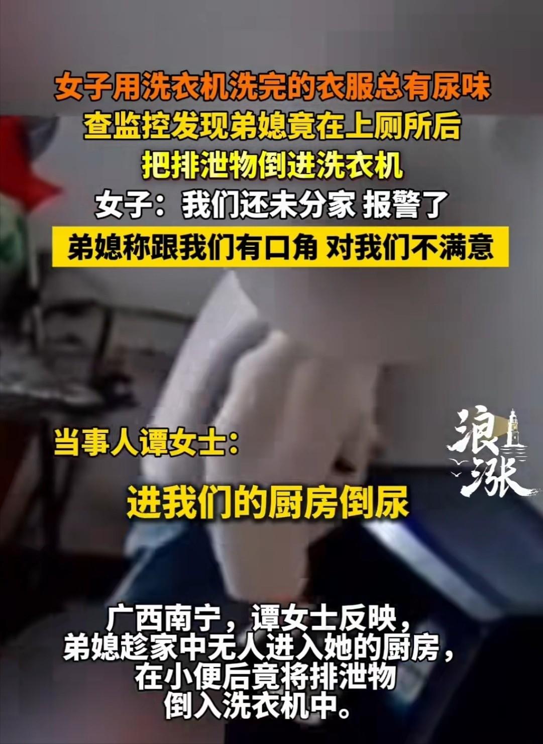 一辈子的阴影!广西南宁,女子因为自家的洗衣机里长期有怪味,就在家里装上了监控。画面显示:一个人进入厨房后,拿了她家灶台上的烧水壶,在角落里小便,随后把排泄物倒入洗衣机,把烧水壶放回原处,而真相,直接让她三观尽碎! 广西南宁的谭女士怎么也想不到,困扰全家人一年多的难闻气味,其来源竟然是她的弟媳。 事情要从2025年初说起。家里的洗衣机开始散发一种说不清道不明的臭味,像尿骚味,又不完全是。谭女士换了十几种洗衣液,刷内桶、通排水、装滤水器,折腾了大半年,最后咬牙花几千块换了台全新的。 可谁曾想,新机器才用了没几天,之前那股异味就再次出现了。 这下谭女士真慌了。她甚至怀疑是不是水质出了问题,或者有野猫钻进屋里搞破坏。被折磨到快崩溃的她,最后装了监控。 今年3月10日,真相大白。 监控画面里,弟媳鬼鬼祟祟进了厨房,先是盯着摄像头看了几秒,确认没人后,拎起灶台上的烧水壶就蹲在角落里小便。 更让人心酸的是,她年幼的儿子这时突然跑进来找妈妈,就默默站在一旁,茫然地看着眼前发生的一切。这个当妈的连收手的意思都没有,面不改色地忙完,拎着那半壶黄色液体,当着孩子的面倒进了洗衣机。 倒完后,她擦亮水壶放回原位,还冲着摄像头笑了一下,抱起孩子走了。 谭女士看完监控,整个人都麻了。这一年多来,全家人穿的衣服、喝的水,全在这些东西里泡着。这份心寒并非换台新洗衣机就能抹平,那是从心底蔓延开来的冰凉,只怕这一生,都难以真正释怀。 第二天她选择报警处理。等民警赶到现场后,弟媳没有过多辩解,很快便如实承认了相关情况。问她为什么这么干?答案轻飘飘的:几年前两人吵过架,她心里憋着火,想用这种方式报复。 几年前的一场口角,换来一年多的"生化报复"。这已经不是普通的怄气了,这是心理彻底扭曲的表现。 当地警方经调查后认定,此事系家庭矛盾引发的过激行为,并建议当事人通过法律渠道妥善处理。按《民法典》,蓄意侵害他人健康的,得承担侵权责任。但就算法院判了赔偿,那又怎样?谭女士说,她现在连杯子都不敢碰,一拿起来脑子里就闪回那个画面。 这种心理创伤,是钱能买回来的吗? 事情传开后,街坊邻居看这家人的眼神都变了。谁敢跟这种人打交道?两家人虽然还没搬走,但这日子显然是没法过了。 最讽刺的是,这事最后演变成了一条公共安全建议:同住的家庭,关键地方该上锁就得锁,公共物品要界清责任。 可当我们需要用防盗的逻辑来防范家人时,"家"这个字,还剩下什么意义? 参考信息:广西一女子洗衣服感觉有异味,装监控发现竟是弟媳将排泄物倒进洗衣机:两人曾发生口角,心生不满 2026-03-13 14:51·闽南网