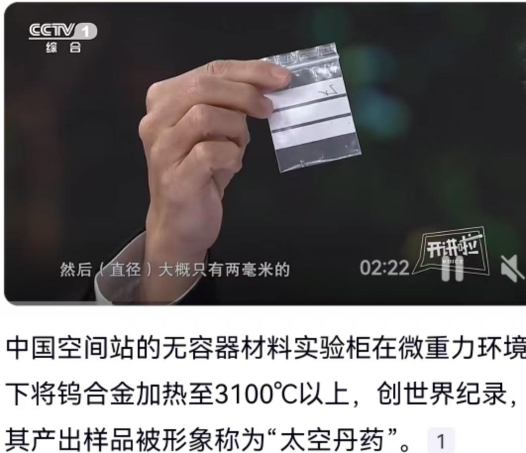 在距离地面约400公里的浩瀚太空中,中国空间站里正上演着一幕极具神话色彩却又硬核十足的科技大戏。 大家都在聊“太上老君的炼丹炉”,这回咱们中国是真把炉子架到了天宫里。就在这个独特的微重力环境下,中国空间站的无容器材料实验柜干了一件惊天动地的大事:它成功将钨合金加热至3100℃以上。这一温度数据,直接刷新了世界纪录,那个产出样品也被大伙儿形象地称为“太空丹药”。 这可不是什么玄幻小说里的情节,而是实打实的尖端科学。 很多人可能会问,为什么要跑到太空去炼“丹”?在地面上不行吗?这就得说到那个让人头疼的“重力”了。在地面上,我们加热材料离不开容器,要么是坩埚,要么是模具。可一旦温度高到3100℃,极少有容器能扛得住,往往材料没炼好,容器先化了,或者容器杂质渗入材料,导致纯度不够。 而在中国空间站的微重力环境下,材料可以悬浮在空中,通过静电场控制,完全不接触容器进行加热。这就是“无容器”技术的牛之处。没了容器的限制,咱们就能把像钨合金这种高熔点材料加热到前所未有的温度,还能研究它们在深过冷、非平衡态下的奇特性质。 最近,在央视《开讲啦》节目中,中国科学院空间应用工程与技术中心研究员张璐向主持人撒贝宁展示了这件珍贵的“太空丹药”。看着那个小小的样品,或许普通人觉得不起眼,但它身上承载的却是材料科学的巨大突破。这种在极端环境下“炼”出的材料,其内部结构往往更加均匀、完美,能为未来研制新型高温合金、活性金属提供极其宝贵的数据支持。 这“炼丹炉”的技术含量,体现了中国在空间应用领域的深厚功力。要知道,在太空这种真空、高辐射、极度温差的恶劣环境里,要精准控制一个3100℃的高温悬浮液滴,难度不亚于在针尖上跳舞。这不仅需要精密的加热控制技术,还需要极高灵敏度的悬浮控制系统。 这一纪录的诞生,意味着中国在空间材料科学领域已经站在了世界前列。咱们不光是去太空“出差”打卡,更是去干实事、搞科研的。这些“太空丹药”带回地球后,可能会在航空航天、医疗器械、精密制造等多个领域引发连锁反应,甚至催生出下一代高性能材料。 回头再看网友们的调侃,称其为“炼丹”,其实是对中国航天科技一种最质朴的赞美。从神话传说里的“太上老君”,到如今中国空间站里的无容器实验柜,跨越千年的梦想,终于在科技的加持下变成了现实。这颗“太空丹药”,炼的是中国航天的硬实力,服的是探索未知、造福人类的科学心。 以上内容仅供参考和借鉴