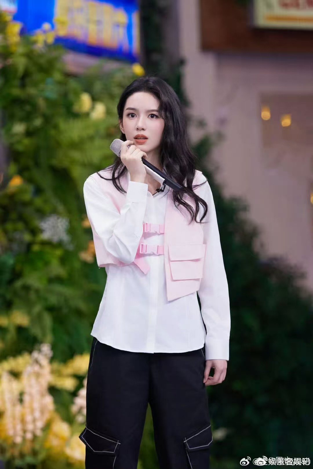 刘亦菲这条裤子挺养生,毕竟降温了肚脐眼必须护住啊
