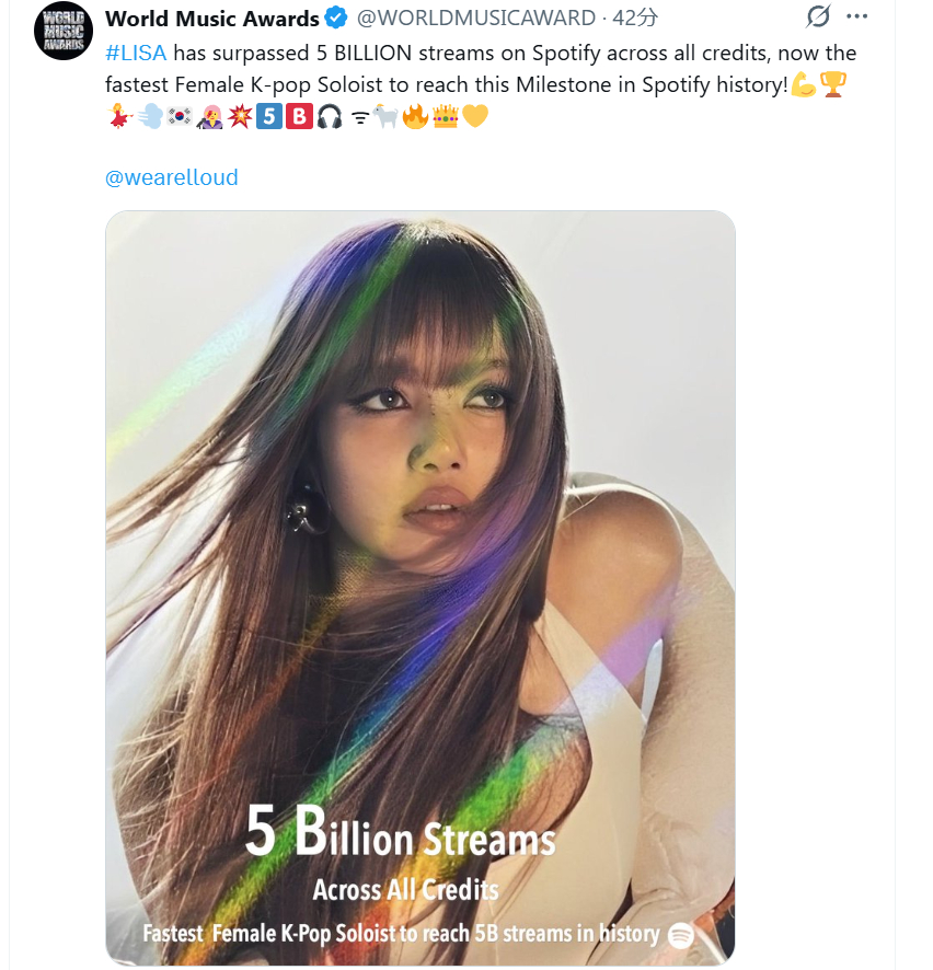 LISA 在 Spotify 上的累计流媒体播放量突破 50 亿次,成为 Spotify 历史上达成此里程碑最快的韩国女 solo 歌手!💪🏆💃💨🇰🇷👩🎤💥5⃣🅱️🎧 ᯤ🐐🔥👑💛