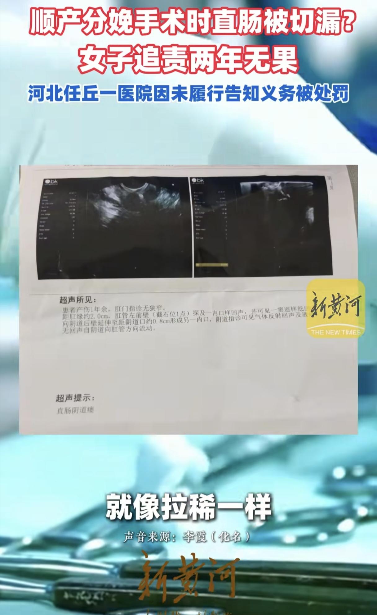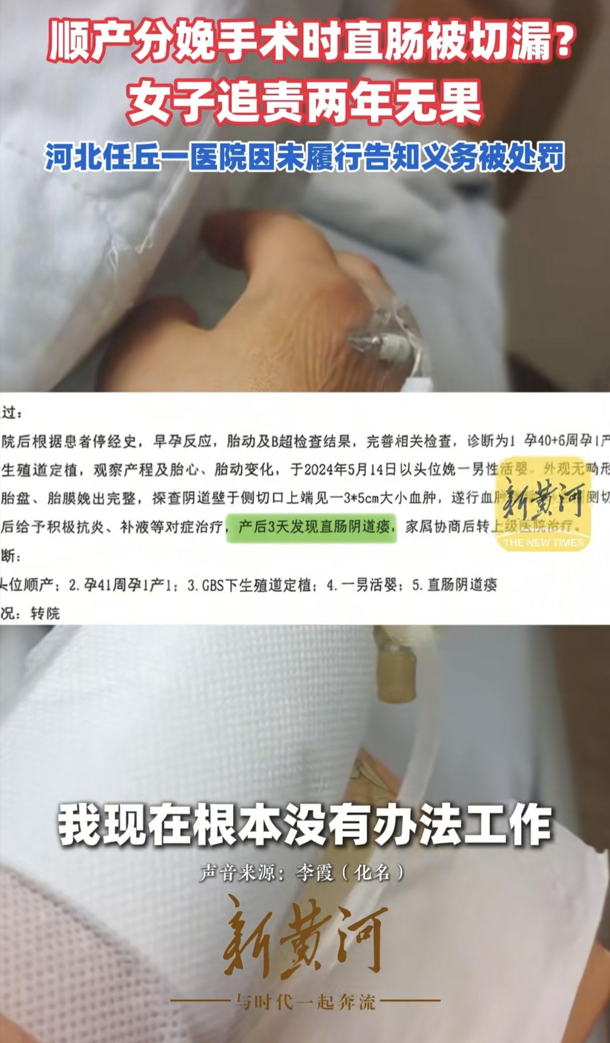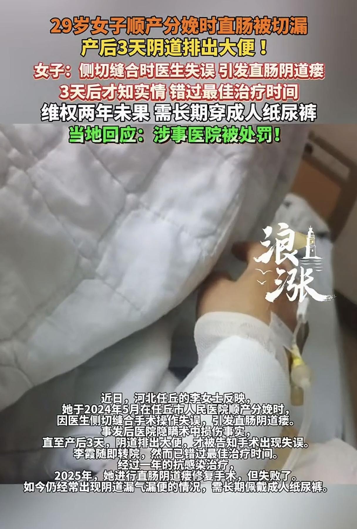 一次顺产手术竟成噩梦!29岁李女士顺产后侧切缝合时,直肠竟被扎穿,导致大便从阴道漏出,就像拉稀一样,得长期佩戴成人纸尿裤,根本没法工作! 李女士是2024年5月份顺产后,侧切缝合时,第一次医护人员扎穿了她的直肠,随后拆除进行第二次缝合。 医生只说有个血肿,并没有告知实情,还是李女士在住院第三天自己发现了情况不对劲,开始从阴道漏大便。 李女士在涉事医生的帮助下转院后,联系方式就被医生拉黑,医生也没有受到任何处罚,还在医院继续上班。 但李女士却错过了最佳治疗时间,2025年,李女士做了一个系统性的手术,但是失败了。 李女士在各个平台对医院进行投诉后,相关部门只对医院进行了行政处罚,罚款5万元,李女士目前已经花了十几万了,却没有拿到一分钱的补偿。 医院也没有任何态度,就好像这件事跟他们没有任何关系一样,互相推责! 一次意外,造成一辈子的困扰!为什么事发第一时间,医生选择隐瞒实情呢?难道是存在侥幸心理,觉得能自己长好? 如果能第一时间告知,说不定就能及时修复,也不至于影响人家一辈子!一个医生如果没有起码的责任心,又怎么能配当一个医生? 现在弄得李女士经济压力大、生活上带来困扰、心理上带来伤害,才29岁的妈妈,让人家后半辈子怎么办? 而且这么明显的错误,患者还需要维权两年,医院出了事故不能勇敢站出来面对,让患者还怎么信任医院? 必须追责!希望医院能给出个说法,让受害者的心理得到一丝安慰,最好是能帮助李女士到更大更好的医院修复好,让她恢复正常的生活,要不然下半辈子就真的毁了!