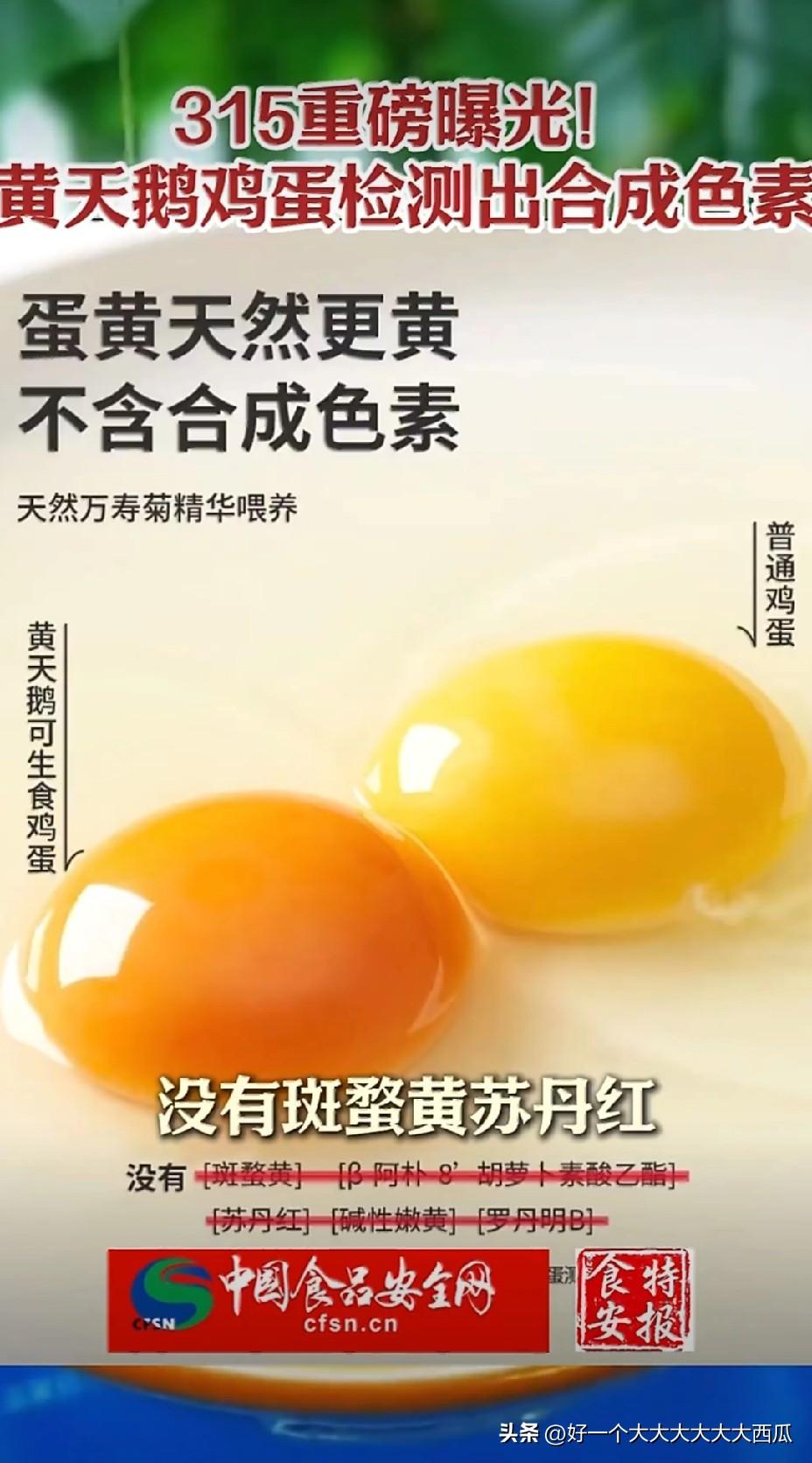 315突然曝光知名品牌! 之前就听说黄天鹅鸡蛋可以生吃, 而且宣称是不含任何合成色素的, 可是浙西中国食品安全网抽检黄天鹅鸡蛋, 发现鸡蛋里面含有人工合成色素“斑蝥黄”(角黄素)。 虽然说这个什么“斑蝥黄”色素是国家允许添加的添加剂, 可是这相当于之前所谓的不含任何人工色素的宣称就是虚假宣传了, 现在很多家庭给孩子都是买黄天鹅鸡蛋, 哪里知道号称高端无添加的品牌, 最后还是这样背刺了消费者。