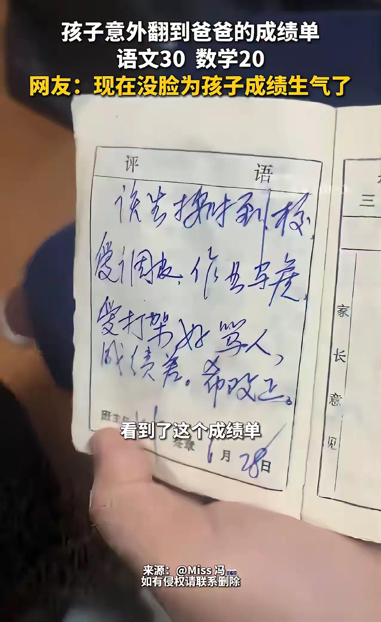 笑死了,我爸当年是“学渣”。🤣 江苏苏州苏女士一家过年回老家,婆婆收拾东西时,意外翻出孩子爸爸的小学成绩单,语文30、数学20,只有思想品德60分勉强及格,看了后面评语,给两孩子都笑翻了。平时总教育孩子的爸爸,这下黑历史被扒光,看着爸爸小时候也不是省油的灯啊! 苏女士说,当时婆婆在老房间翻旧物,这本皱巴巴的小学生手册就掉了出来,本来只是想看看老物件,结果一翻开就看到了孩子爸爸的“辉煌战绩”。语文30、数学20的分数,连及格线都没沾边,也就思想品德靠着“态度还行”拿了60分,勉强保住了一点颜面。后面班主任的评语更是直白得可爱:“该生操行到校,爱调皮,作业马虎,爱打架好骂人,成绩差,希改正。”字里行间都透着老师的无奈,活脱脱一个让人头疼的“皮猴子”形象。 这张成绩单一曝光,家里瞬间笑成一团。平时对着孩子板着脸,念叨“要好好学习”“别总想着玩”的爸爸,此刻站在旁边脸都红到了耳朵根,连反驳的话都说不出来。两个孩子更是抱着肚子笑,拿着成绩单追着爸爸问“原来你小时候比我还调皮啊”“那你凭什么说我考得不好”,场面又热闹又好笑。 其实仔细想想,这种“黑历史”被扒的瞬间,反而戳中了很多家庭的痛点。不少家长总爱拿着“我当年多努力”“我小时候成绩多好”来教育孩子,可真要翻出自己的旧成绩单,未必有现在的孩子争气。大家都习惯了站在成年人的视角,用高标准要求孩子,却忘了自己也曾是那个上课走神、作业拖拉、满脑子想着玩的小孩。 这张分数惨淡的成绩单,并没有让爸爸在孩子面前失去威严,反而拉进了彼此的距离。孩子会觉得“原来爸爸也不是天生就厉害”,家长也能更共情孩子的学习压力,少一点说教,多一点理解。比起完美的“学霸家长”,这种带着烟火气的“学渣黑历史”,反而更能让孩子感受到真实的亲情,也让家长明白,教育从来不是居高临下的指责,而是和孩子一起成长的过程。 各位读者你们怎么看?欢迎在评论区讨论。