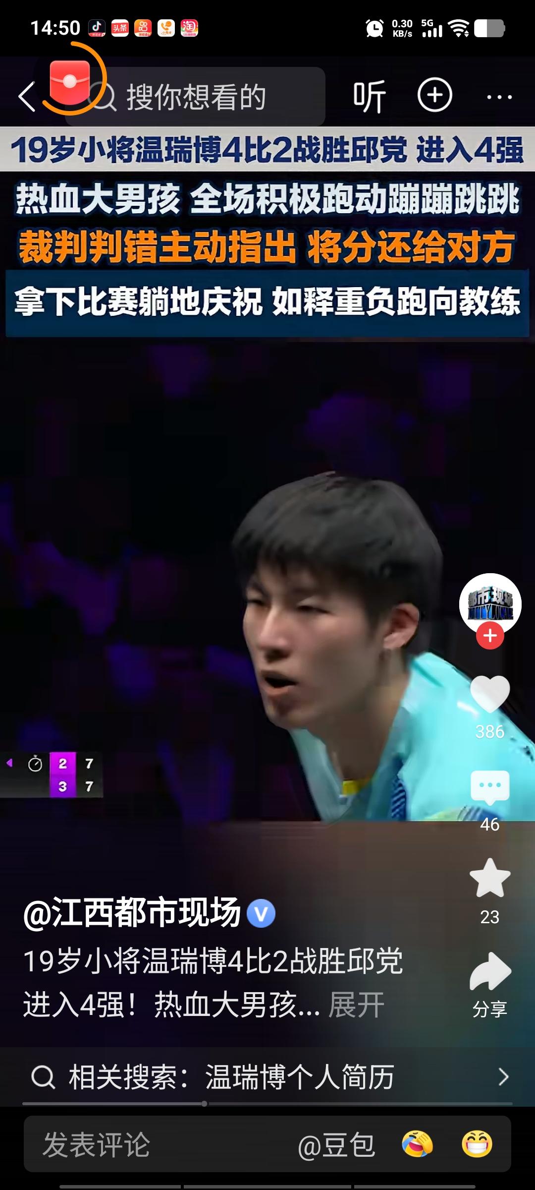 温瑞博4比2淘汰张本智和,强势闯入决赛,今晚他将与小勒布伦争夺重庆站冠军。小将温瑞博未来可期,今天能战胜张本智和确实不简单,彻底打碎了张本宇一双儿女,在自己的家乡同时进入男女单打决赛,都拿冠军的美梦。