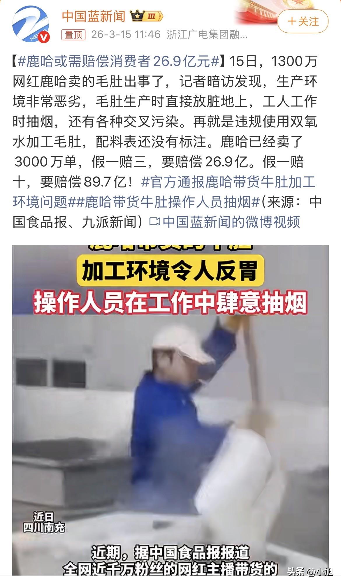3月15号下午,南充市监局的一纸通报,把“鹿哈”推到悬崖边上。通报里说得很清楚,涉事的四川川牛福食品有限公司已经立案调查,责令停产整顿,原料成品全部封存送检。可这把火,烧的不只是那个脏乱差的厂子,还有那个坐在长沙豪宅里、曾经自曝7个月赚了3500万的网红本人。 真要按他直播里拍着胸脯承诺的“假一赔十”来算,89.7亿。这个数字是个什么概念?把他去年在长沙买的那套1100万的豪宅,加上那辆277万的豪车,再把他名下那两家还在经营的公司全卖了,连零头的零头都够不上。他之前自爆7个月赚3500万,已经觉得是天文数字了,可这89.7亿,得让他不吃不喝直播200多年。 现在最大的悬念是,这笔钱他到底赔不赔得起?或者说,他压根就没打算自己赔? 他的团队反应很快,3月15号当天就出来说话了。大概意思有三层:第一,这毛肚是跟品牌方合作的,当时厂家给的许可证、检测报告都是齐全的,给我们看的视频里车间也“很正规”。第二,其实因为这款商品评分不高,我们早就换了厂家,没卖了。第三,等官方调查结果出来,真有责任,我们去找品牌方和厂家追责,对消费者负责。 这话说得滴水不漏,但仔细品,味道不对了。他把责任一层一层往外推,推给品牌方,推给厂家。可消费者是在谁的直播间下单的?是冲着谁的脸、谁的口碑买的?是那个叫“鹿哈”的千万粉丝大网红。 更让人堵心的是,记者去问他家店铺客服,客服就回了六个字:正在核实相关情况。这六个字,和那89.7亿的赔偿比起来,轻得就像什么都没发生过。 翻翻这个“鹿哈”的发家史,挺有意思。2022年他靠模仿鹿晗出道,组了个山寨男团ESO,什么“王二博”、“易烊干洗”,专门蹭明星热度。当时被骂得不轻,土味、山寨、拼夕夕男团,后来扛不住舆论压力,才改回本名凌达乐。可骂归骂,人家真金白银赚到手了,豪宅豪车买上了,转型带货主播,7个月3500万,完成了从“山寨明星”到“人生赢家”的逆袭。 这次毛肚出事,他算是被扒了个底朝天。 说到底,这事卡在一个尴尬的地方。他说厂家资料齐全,他说自己也是被骗的。可那些在脏地上晾着的毛肚,那些工人抽烟弹进去的烟灰,那些违规用的双氧水,最后都进了消费者的肚子。3000万单,就算一单只赚一块钱,那也是3000万。可这3000万里,有多少是靠着粉丝对那张脸的信任换来的? 现在,官方通报已经出来了,厂子也封了。检测结果还没出,赔偿的事还在半空悬着。可有一点已经清楚了,不管最后是赔三还是赔十,这钱指望从那家南充的厂子里掏出来,比登天还难。那这窟窿谁来补? 89.7亿,对那个在直播间里喊着“家人们”的网红来说,是一辈子都够不着的高度。可对那些吃了他家毛肚的消费者来说,要的不过是一个说法,一个安心的交代。 你觉得,这钱该不该让他赔?