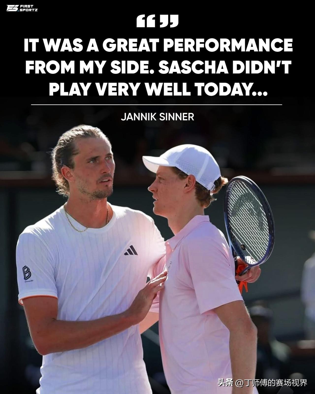 辛纳直落两盘击败兹维列夫,首次晋级印第安维尔斯大师赛决赛,这也是他本赛季的首个决赛。 赛后,这位世界排名第二的球手在场边接受采访时谈到自己的表现:“这是一项伟大的成就,我第一次在这里打进决赛,因此意义非凡。打进半决赛也是第三次,所以我非常高兴,后面会发生什么一起期待吧,当然接下来将会是一场非常艰难的考验。最重要的还是这个星期我们在这个赛事中都取得了进步。” “我今天的表现很不错,我觉得萨沙今天打得并不好。我在第一盘几次破发,这给了我继续前进的信心,而且我在关键时刻的发球也非常好,我很开心。” 辛纳在印第安维尔斯大师赛半决赛以6-2/6-3轻松击败德国小巨人兹维列夫,职业生涯首次在这里打进决赛,他将和梅德韦杰夫争夺最后的冠军,俄罗斯人同样直落两盘爆冷淘汰世界第一的阿尔卡拉斯。
