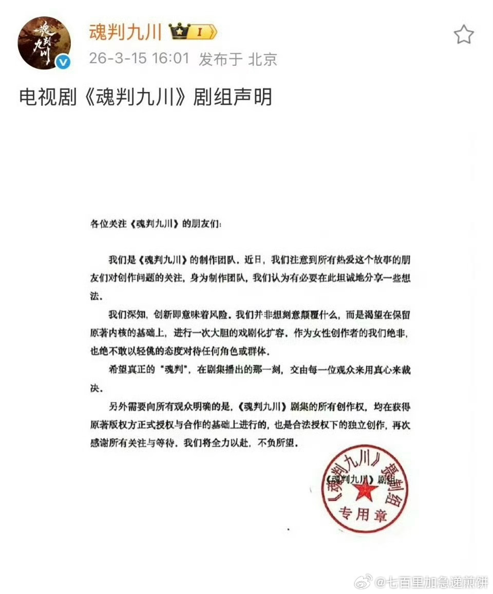 田嘉瑞的《魂判九川》官博回应原著大女主小说性转大男主的争议: