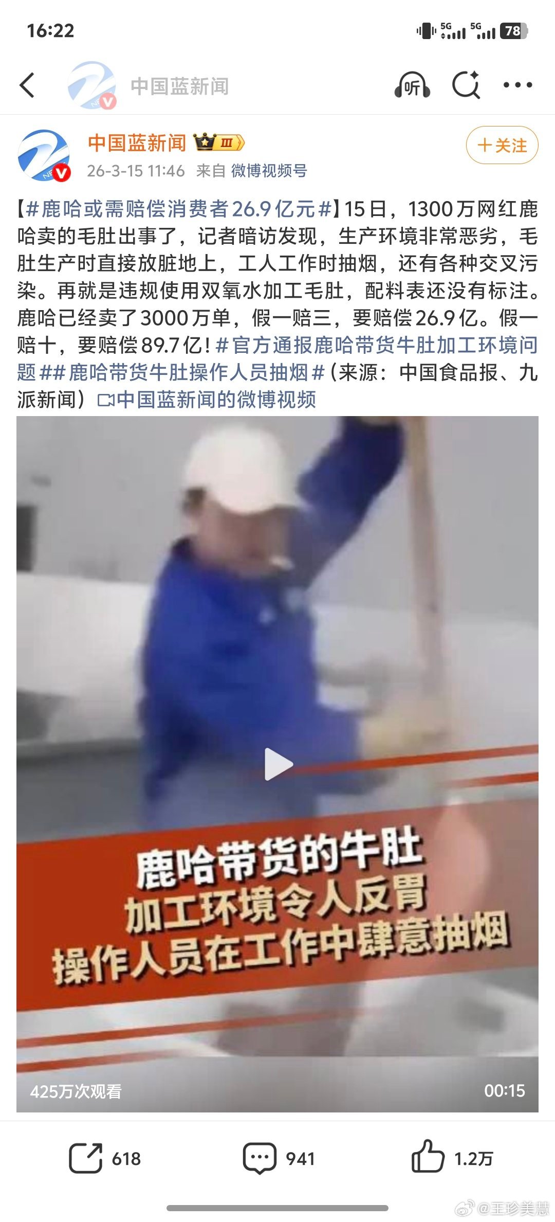 鹿哈或需赔偿消费者26.9亿元假一赔十。。。哥们真的是只顾赚钱不顾健康啊之前还说孕妇都可以少吃点就这生产环境简直了。。。