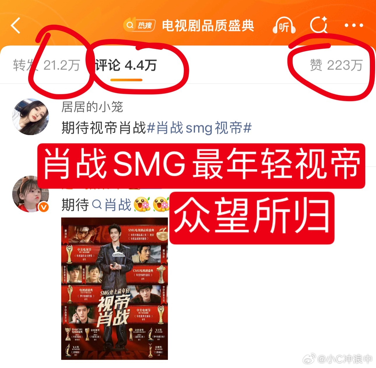 肖战smg视帝电视剧品质盛典东方卫视🍅:肖战斩获SMG最年轻视帝👑223万点👍🏻、21万转发,人气爆棚,民心所向,实至名归👏这就是实力
