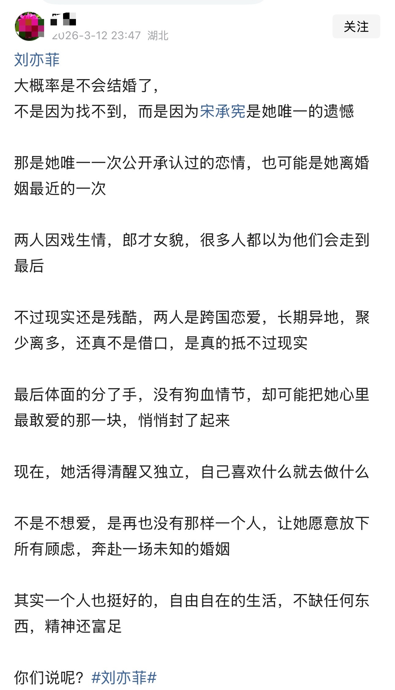 刘亦菲大概率是不会结婚了,不是因为找不到,而是因为宋承宪是她唯一的遗憾