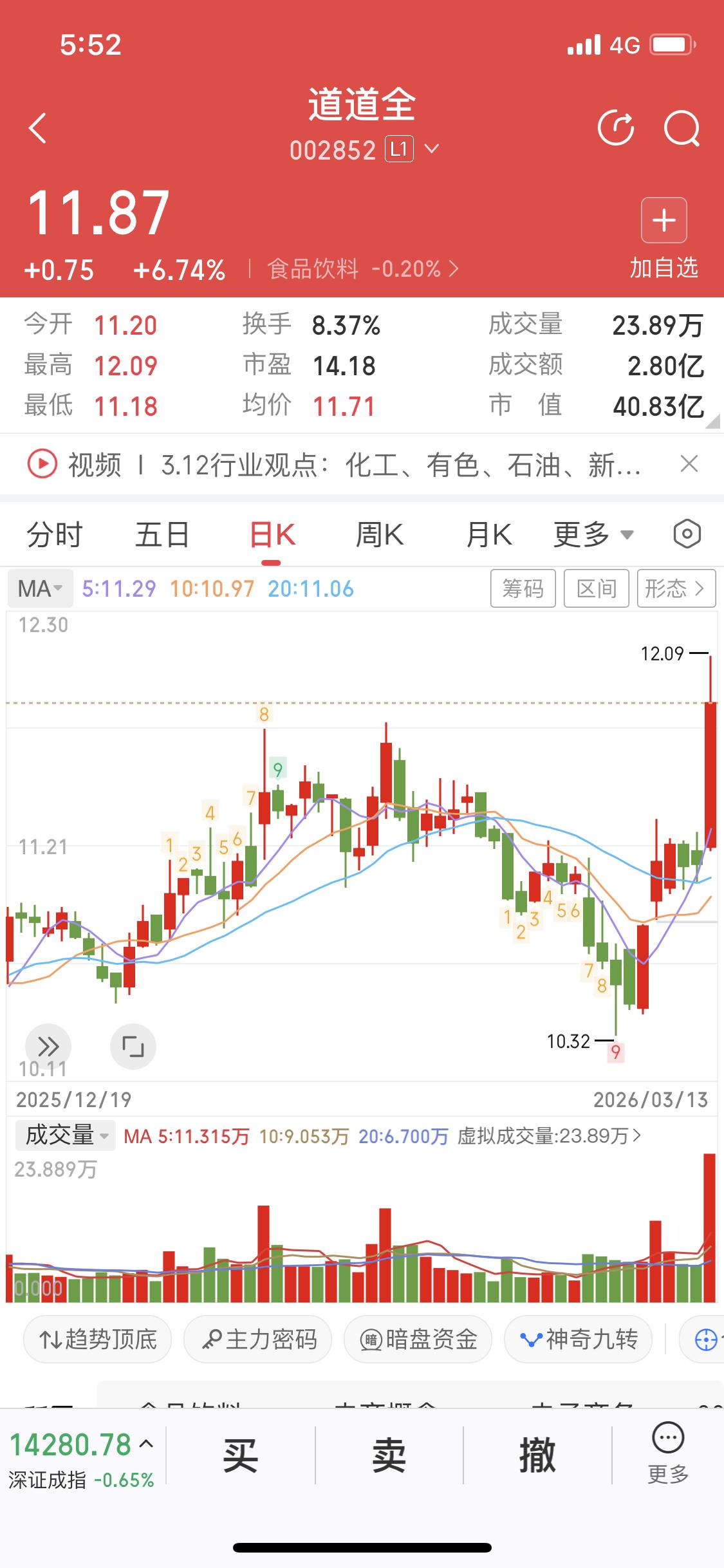 3月15日我盯上了道道全这只做食用油的股票。本周五它一根放量大阳线突破前高,这可是个很积极的信号,所以我觉得下周大概率看涨。虽然不能绝对说明天就涨,但刚放量突破前高,明天回调的可能性不大。 我关注它但没买入,后续只要五日线不拐头向下,趋势不变我就会一直关注。从公司情况看,近期菜籽油原料供给趋向宽松,油脂价格下跌,成本或有影响。不过,它2022三季报显示归母净利润为负。兴平工厂还没动工,一切有待观望。