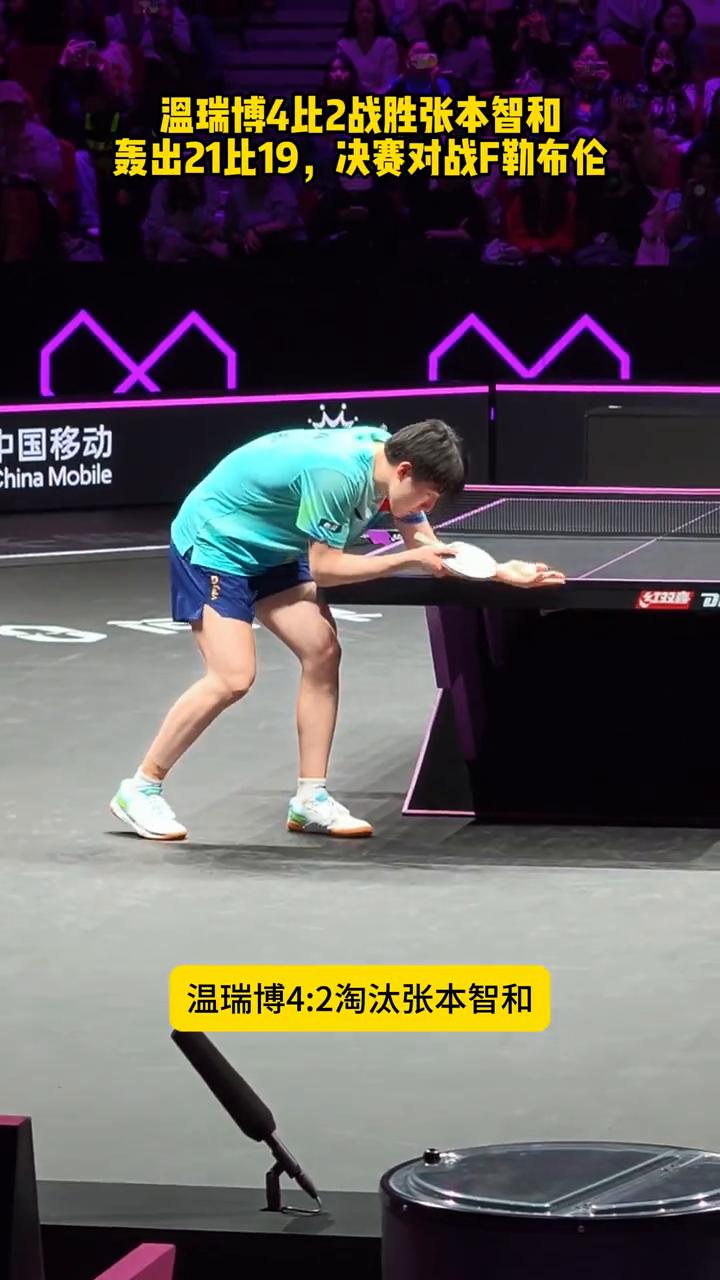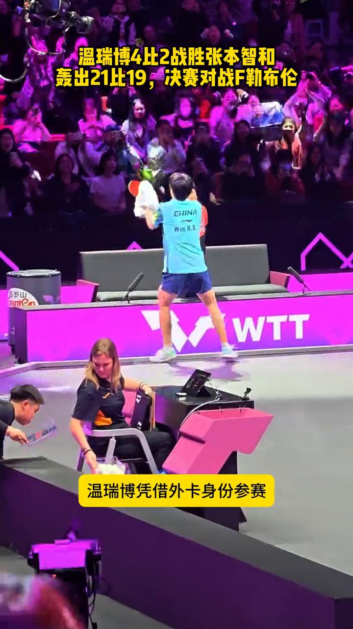 温瑞博4比2战胜张本智和,轰出21比19,决赛对战F勒布伦。 太燃了!WTT重庆冠军赛男单半决赛,温瑞博4:2淘汰张本智和晋级决赛,全场沸腾,最后一局轰出21:19,太精彩了!温瑞博凭借外卡身份参赛,一路黑到底,也是中国唯一的独苗。决赛将对战F勒布伦,期待他拿下冠军,加油!