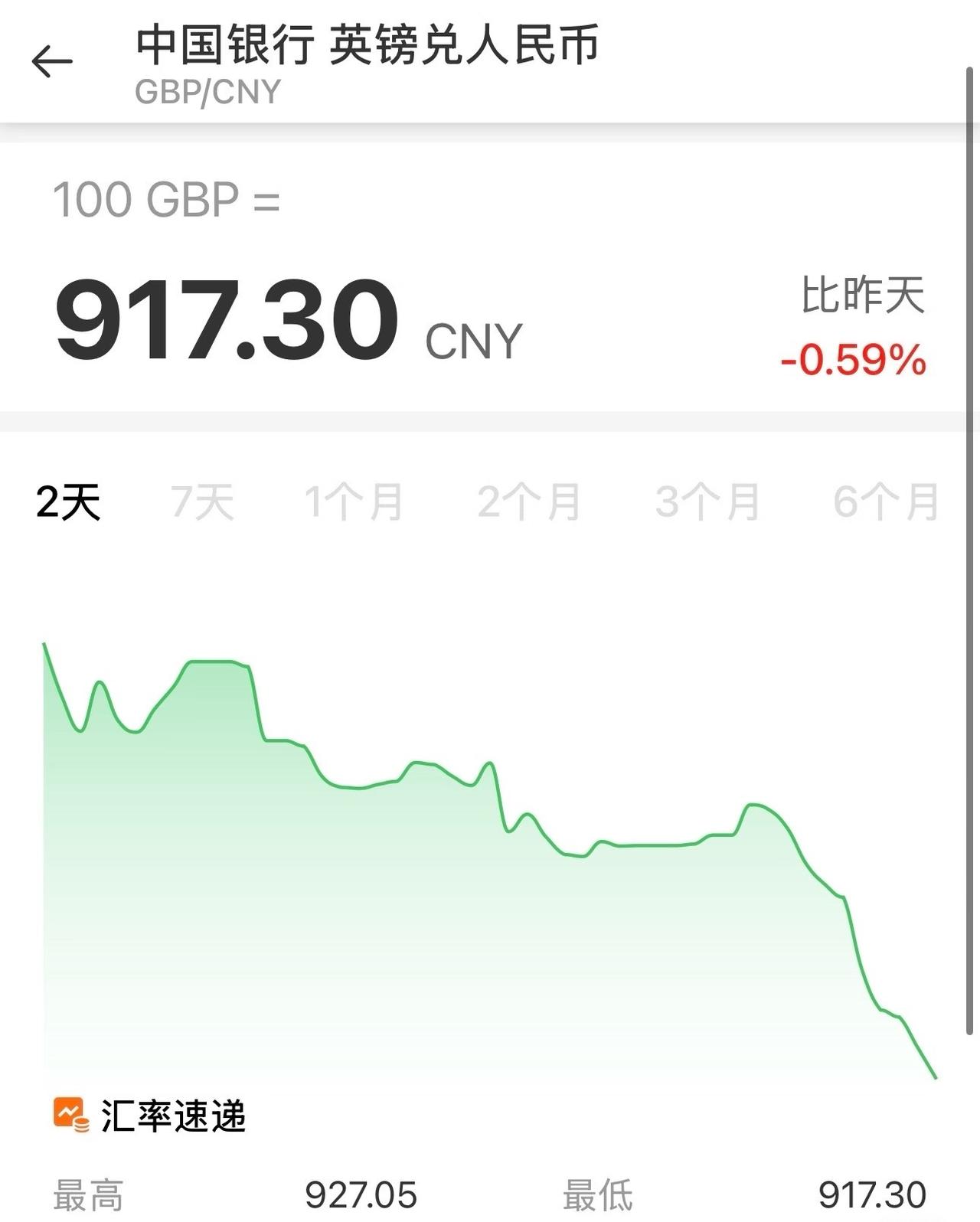 英镑暴跌9.09?26fall可以冲了吧 最近几周的汇率感觉很跌宕起伏, 今天中行卖出价是 9.17左右,比之前动辄9.8几好多了 目前是最近6个月最低点! 有刚需的小伙伴可以冲了吧!