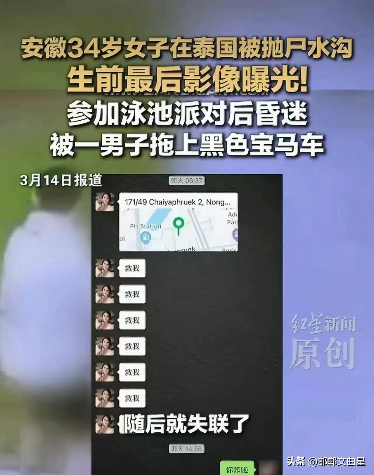 太痛心!泰国被抛尸水沟女子生前影像曝光,最后画面太绝望 监控里,她已经意识不清,被男子半拖半抱塞进宝马车带走。 这竟是她留在世上的最后画面。 事前她曾拼命给朋友发“救我”、发定位, 却还是没能逃过这场厄运。 几天后,有人发现她的尸体被抛在200多公里外的水沟,而且上身裸露着,死后连最后一点尊严也没留。 一条鲜活的生命,就这样没了。 据悉,女子34岁,安徽人,已经在泰国打工2年,家里有一个三岁孩子,每月都给老公打钱,年前还曾给舅舅打了5万元,给舅妈转520。 目前,警方已锁定一名嫌疑人,该嫌疑人姓赵,是国内一名男子,在泰国做生意,他和被害女子是在一个老乡群里认识,然后互加好友。 出事那天,女子去参加一个泳池派对,赵某也去了,后来女子出现昏迷,有人说她被人下了药或毒,清醒时曾给朋友发“救我”,并发了定位。 但还是晚了一步,报警后数日,警方才在数百里外的地方发现她已腐烂的尸体。 本想着是老乡,没想到却死于老乡之手。 这件事在网上发出来后,引起网友们热议。 有网友说,看得头皮发麻,最后那句“救我”得多绝望啊,好好一个姑娘就这么没了。 还有网友说, 永远不要低估人性的恶,尤其是在异国他乡,即便是老乡,防人之心也一刻都不能少。 还有网友说,笑脸相迎的不一定是人,也可能是魔鬼,女孩子在外一定要保护好自己。 因此,大家出门在外,真的不能心软,不能大意, 陌生局、私密场所、来路不明的饮料,一律远离。 你永远不知道,笑脸背后是人是鬼。 对此,大家怎么看?