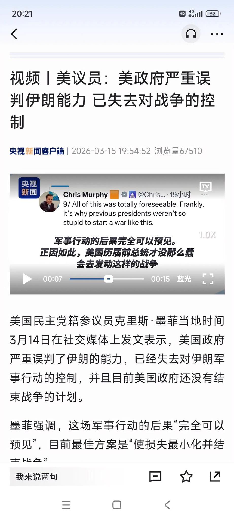 来自央视新闻消息:一位美国民主党参议员在社交媒体上说,特朗普发动对伊朗的打击,是错误的,误判了伊朗的军事能力,没想到伊朗的反击能力这么强大,战争持续半月来,双方交火仍在持续,其结果越来越明显,美国打不赢了,在打下去只会输的更多,失去的更多,战争没有赢家,当今想办法体面的收场,才是特朗普的最明智的选择。美国怎么出现这么个愚蠢的特朗普总统呢?