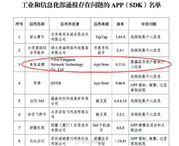 【鱼泡直聘欺骗误导用户提供个人信息】今年“3·15”前夕,工业和信息化部发布了一则关于侵害用户权益行为的APP(SDK)通报,鱼泡直聘被点名直指“欺骗误导用户提供个人信息”。近期,工业和信息化部组织第三方检测机构进行抽查,共发现24款APP及SDK存在侵害用户权益行为,现予以通报。据悉,上述App及SDK应按有关规定进行整改,整改落实不到位的,工业和信息化部将依法依规组织开展相关处置工作。(证券时报)315