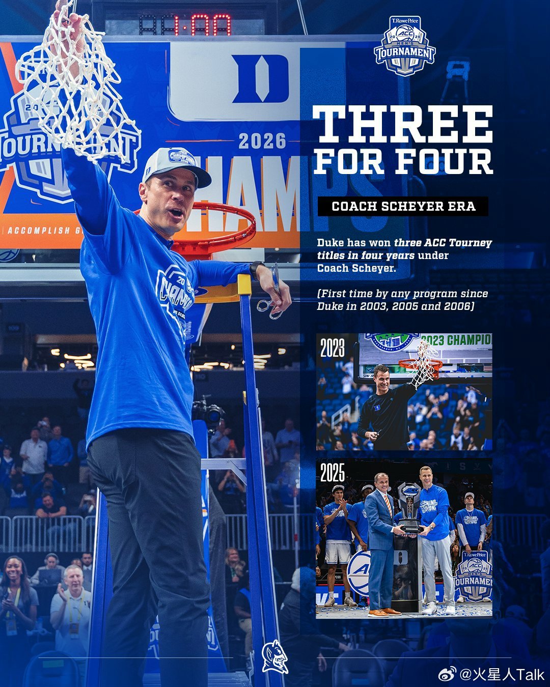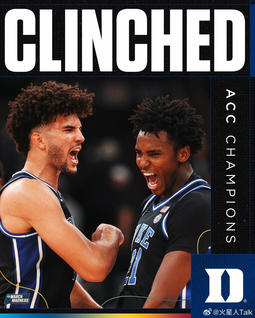 NCAA男篮 2025-2026赛季ACC联盟锦标赛决赛杜克大学击败弗吉尼亚大学,骑士队面对全美第一战绩为1胜33负,其中面对全美第一蓝魔时0胜18负。蓝魔Isaiah Evans14中6得到20分。Cameron Boozer荣获MOP,17中3得到13分8篮板。Cayden Boozer12中6,16分5篮板。本周比赛Caleb Foster和Patrick Ngongba缺席。骑士Malik Thomas13中6得到18分。Sam Lewis11中7得到17分。Ugonna Onyenso6分8篮板9封盖,三场锦标赛合计21个封盖打破邓肯在ACC锦标赛14个封盖纪录。