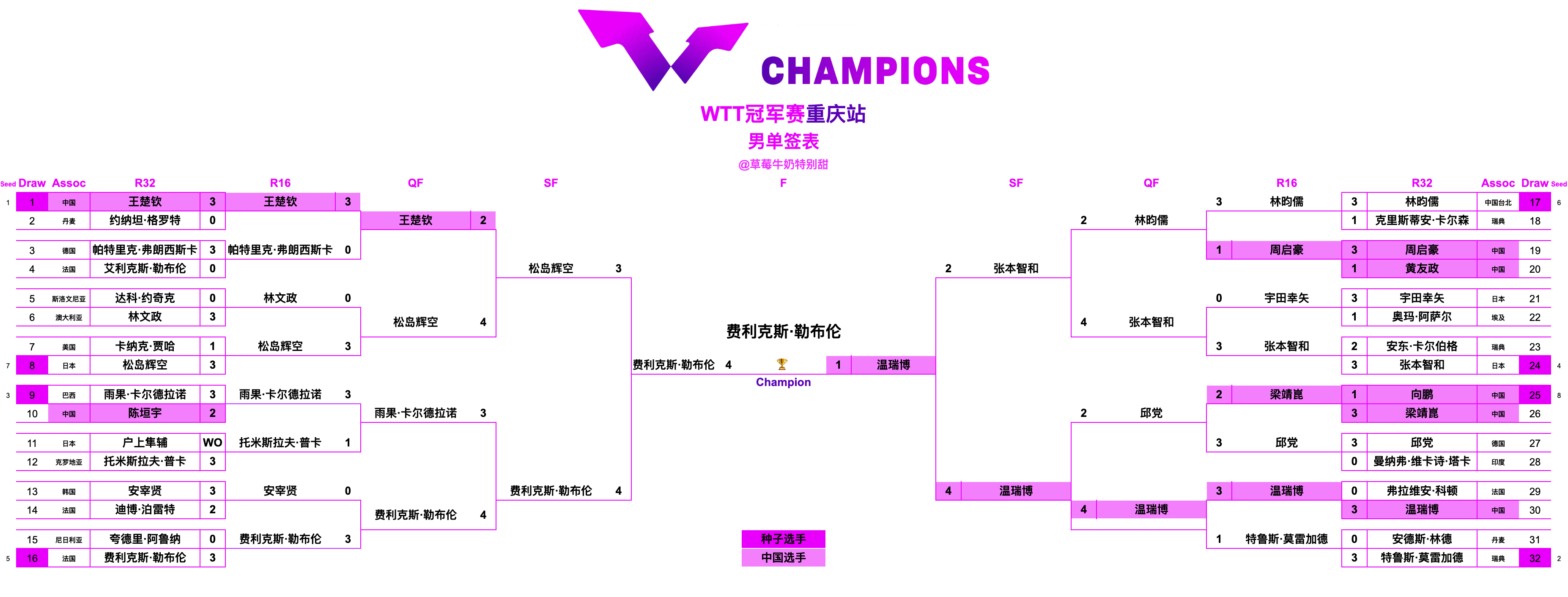WTT冠军赛重庆站丨男单决赛温瑞博🇨🇳1-4费利克斯·勒布伦🇫🇷【5-11,8-11,11-9,7-11,11-13】费利克斯·勒布伦🇫🇷获得WTT冠军赛重庆站男单冠军🥇🎉温瑞博🇨🇳获得WTT冠军赛重庆站男单亚军🥈