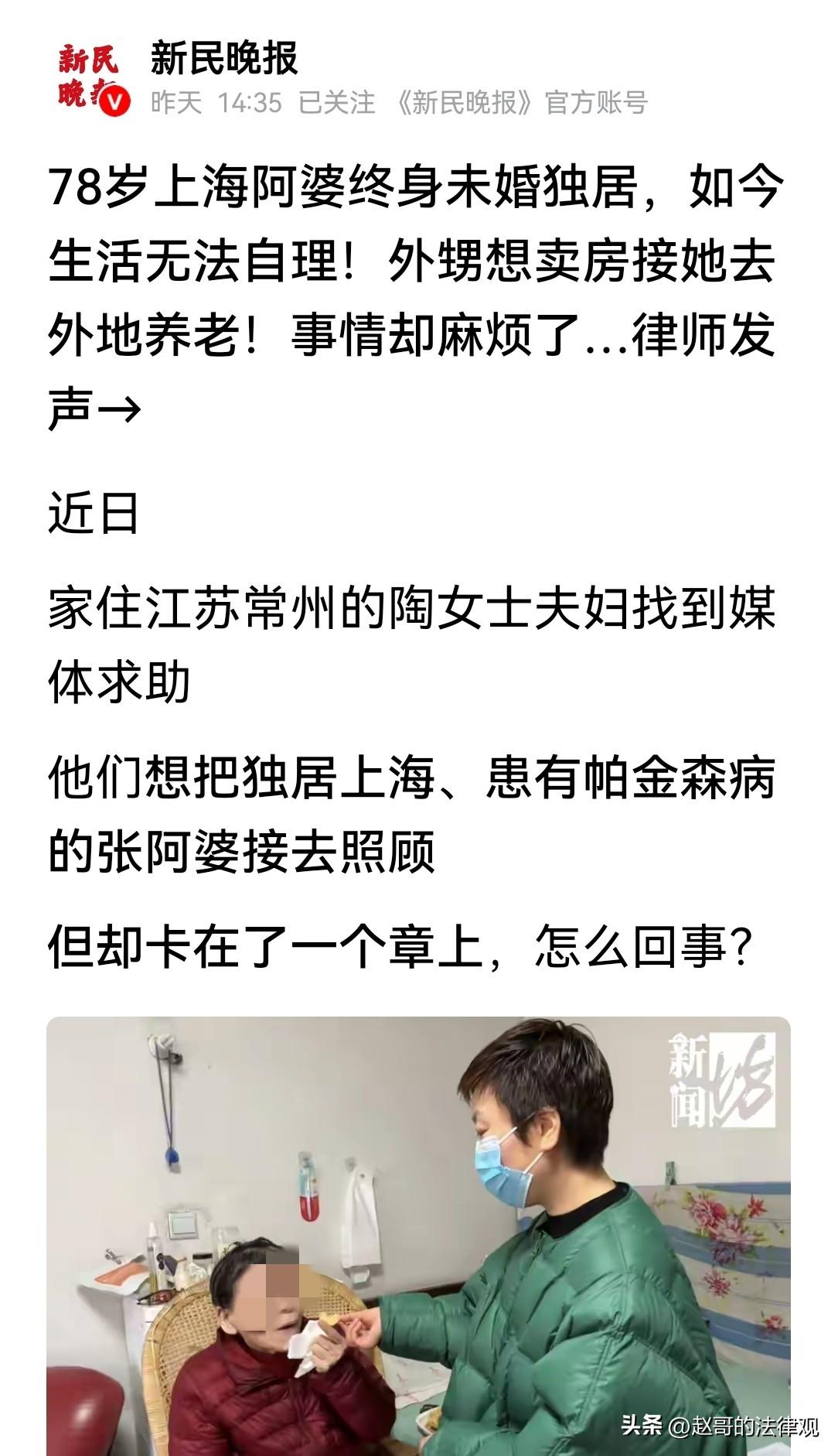 上海闵行,在一个老弄堂里,住着78岁的老阿婆,她一辈子没结婚无儿无女,身患帕金森病,行动早就不方便了。阿婆的生活全靠保姆照料,但她每月的退休金只有5000,而保姆的每月工资高达6800,不够的部分,一直是外甥两口子在添补。外甥想接她去常州养老,卖掉她名下的房子来解决今后的花费,老人同意了,但却被居委会给卡住了,因为阿婆还有8个兄姐,亲属关系盘根错节,这监护权,谁敢轻易给? 阿婆的老屋里,总飘着股膏药混着旧家具的气味,一般人都不爱进这屋。 张阿婆多数时候只能坐在床沿,腿脚早不听使唤,下地走两步都难。 负责照料阿婆的保姆,已经在阿婆家干了多年,工资从几百块钱,已涨到了每月6800。 比阿婆的退休金还高出一截,那多出来的1800,加上两人每月的生活开销,都是阿婆的外甥徐先生两口子默默担着。 阿婆是徐先生的九姨,目前他们来回跑也力不从心了,便琢磨着不如把九姨接到常州,由他们自己照顾。 顺便把阿婆住的这套老房子卖了,用卖房的钱给老人养老。 再说,他们自己生活也不是太富裕,为了老人,他们已经贴补的够多了。 不料,他们想卖房时却被告知,卖房可没那么简单! 就算他们愿意把老人接走养老,也不是说能接人就能接的。 原来阿婆已被认定属于限制民事行为能力人,卖房得先有监护人。 而指定监护人,需要居委会出具证明。 徐先生跑去申请,却在居委会那儿碰了软钉子。 不是为了别的,就因张阿婆家那本“族谱”实在太复杂。 她排行老九,上头有八个兄姐,有的已过世,有的后代远走他乡,甚至有的还在国外,平素极少走动。 居委会负责人愁的头疼:现在要是图省事,把监护权给了徐先生。 将来万一哪天冒出个某某的儿子、某某的孙子,回来争产问责,这责任谁能扛得起? 这不是钱的问题,是关系到老人往后安生立命的大事。 居委会给徐先生说,这事必须慎重,先要起诉到法院,得等法院那边,把其他亲属情况查清楚核实了,我们才敢出证明。 话说到这份上,徐先生和妻子陶女士也没了脾气。 理是这么个理,人家也是怕日后有扯不清的麻烦。 这样,阿婆还得在老房子里多住一段时间。 终于🈶居委会的人专门上门,想听听张阿婆自己的意思。 其实老人说话已经含糊,咿咿呀呀的讲不清,幸亏那一阵头脑还算清楚。 问她愿不愿意让外甥来处理卖房,和照顾她的事,她费劲地点着头,断断续续地重复,同意……我同意。 这句话,成了眼下最关键的凭据。 老人心里明镜似的,自己无儿无女,到了动弹不得的时候,能指望的也就是这个外甥。 她也不想去养老院,愿意跟着外甥去陌生的常州生活。 有了老人这句明白话,徐先生两口子心里也稍稍安定了些。 可居委会那边,态度依然谨慎。 这场围绕一位孤老晚年托付,与财产处置的拉扯,还在继续。 一边是血亲的担当,与现实的无奈。 现在张阿婆每天沉默地坐在老房子里,等着一个能决定她最后归处的答案。 对这个事有网友认为,那些亲戚从不来往,也从不照顾老人,凭啥非得给他们利益? 也有人认为,目前应在居委会的见证下,趁老人清醒时立下遗嘱,或当面签订赡养协定。 既然外甥一直贴钱在帮助老人,那就谁付出,谁得回报才对。 那么,这事儿在法律上怎么说呢? 民法典第二十八条:无民事行为能力或者限制民事行为能力的成年人,由下列有监护能力的人按顺序担任监护人: (一)配偶;(二)父母、子女;(三)其他近亲属;(四)其他愿意担任监护人的个人或者组织,但是须经被监护人住所地的居民委员会、村民委员会或者民政部门同意。 本案中,张阿婆无配偶、子女,父母也已去世,其兄弟姐妹属于“其他近亲属”有监护资格。 但外甥徐先生夫妇,长期照顾阿婆,还补贴生活费用。 从情感和实际付出来看,他们也有担任监护人的意愿和能力。 不过,徐先生作为“其他愿意担任监护人的个人”,要成为监护人,须经居委会同意。 这就是,为什么居委会在监护权指定上非常谨慎。 他们也需综合考虑各方情况,确保符合阿婆的利益,避免后续发生纠纷。 网友出主意,只要遗嘱做好公证,阿婆的财产由外甥继承,外甥负责养老,把老人接到家照顾,房子卖掉贴补空缺费用。 对于这件事你是怎么看的呢? 关注@赵哥的法律观