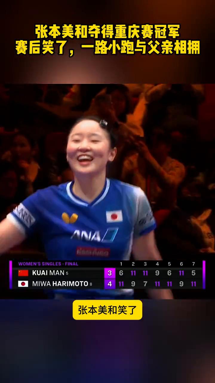 张本美和夺得重庆赛冠军,赛后笑了,一路小跑与父亲相拥。 张本美和笑了,赢球后与父亲相拥。WTT重庆冠军赛女单决赛,张本美和4:3战胜蒯曼,拿下冠军。十七岁的她就拿下首个冠军赛冠军。目前除孙颖莎和王曼昱能稳赢她,其他国乒球员真不一定能赢她。