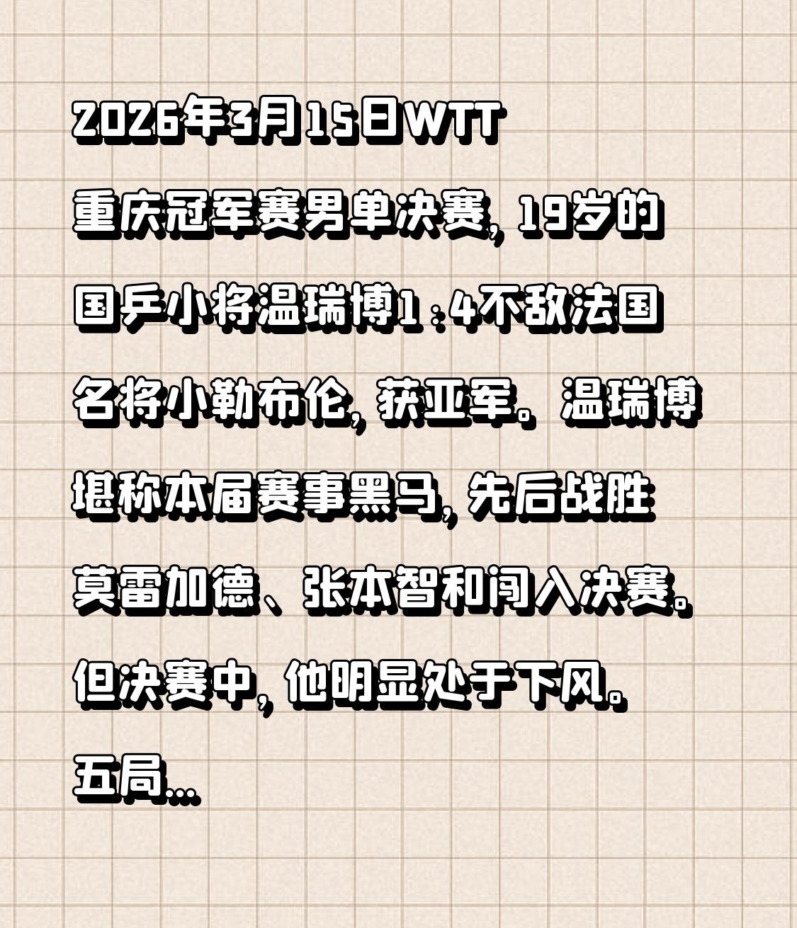 2026年3月15日WTT重庆冠军赛男单决赛,19岁的国乒小将温瑞博1:4不敌法国名将小勒布伦,获亚军。温瑞博堪称本届赛事黑马,先后战胜莫雷加德、张本智和闯入决赛。但决赛中,他明显处于下风。五局比分为5:11、8:11、11:9、7:11、11:13,他失误偏多,往往得1分后又失误丢1分。小勒布伦实力和大赛经验更胜一筹,1/4决赛他还在1:3落后的情况下逆转巴西名将雨果。另外,女单蒯曼也3 - 4惜败张本美和。虽国乒男女单无缘冠军,但年轻选手未来可期。