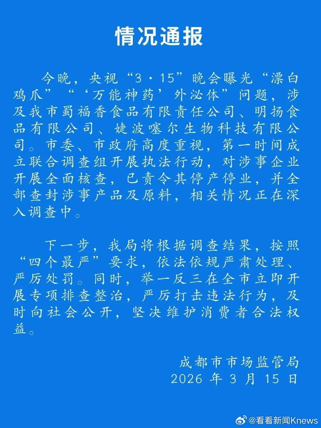 【#成都查封315曝光鸡爪外泌体涉事企业#】成都市市场监管局通报:今晚,央视“3·15”晚会曝光“漂白鸡爪”“‘万能神药’外泌体”问题,涉及我市蜀福香食品有限责任公司、明扬食品有限公司、婕波噻尔生物科技有限公立联合调查组开展执法行动,对涉事企开展全面核查,已责令其停产停业,并全部查封涉事产品及原料,相关情况正在深入调查中。
