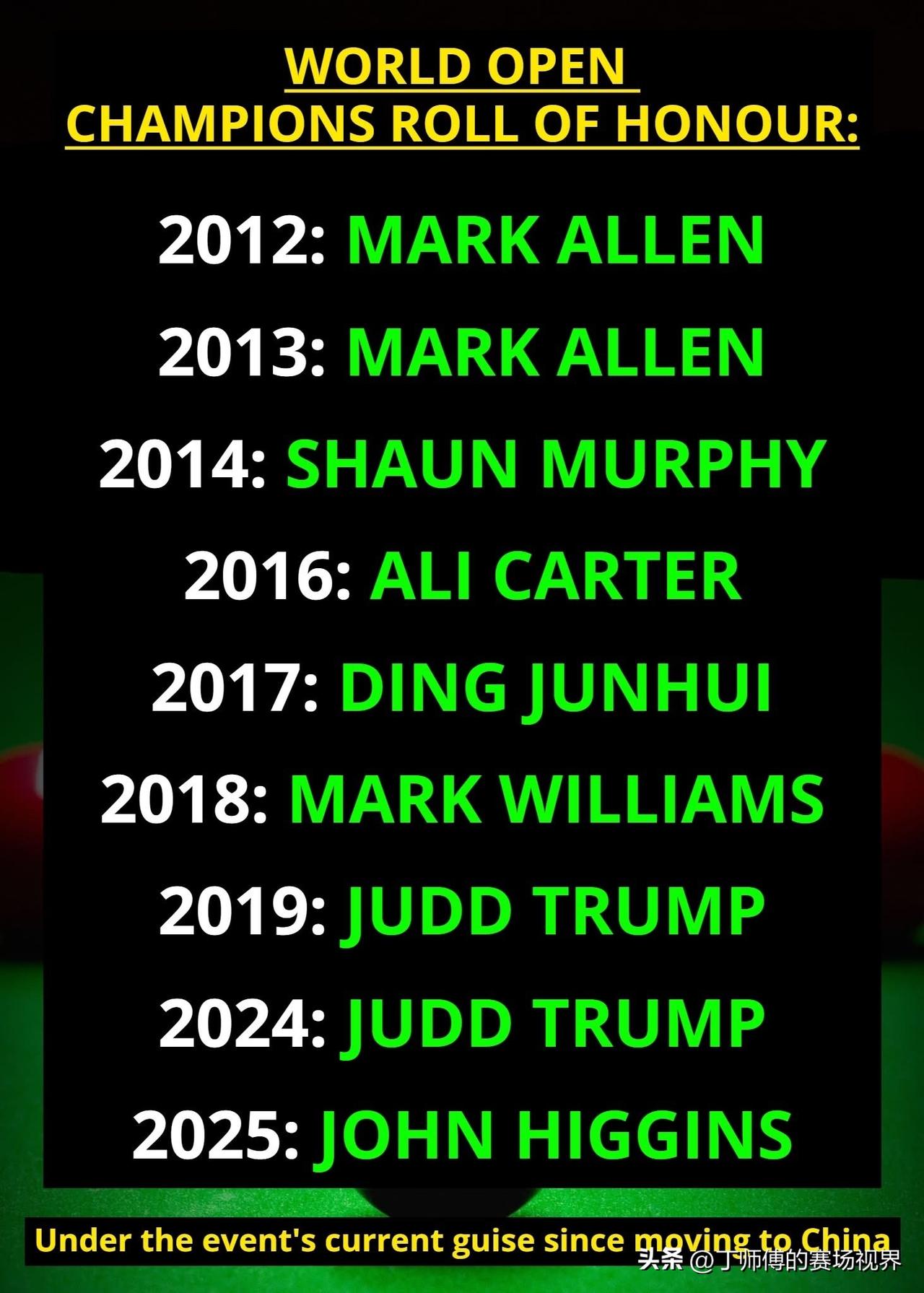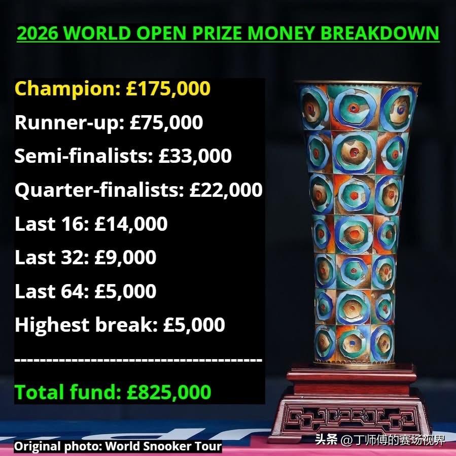 世界公开赛移师中国以来历届冠军榜: 2012年:艾伦(海口) 2013年:艾伦(海口) 2014年:墨菲(海口) 2016年:卡特(玉山) 2017年:丁俊晖(玉山) 2018年:马威(玉山) 2019年:特鲁姆普(玉山) 2024年:特鲁姆普(玉山) 2025年:希金斯(玉山) 2026年世界公开赛奖金分配 冠军:175,000 亚军:75,000 半决赛选手:33,000 四分之一决赛选手:22,000 16强选手:14,000 32强选手:9,000 64强选手:5,000 单杆最高分:5,000 总奖金:825,000 (单位:英镑) 斯诺克世界公开赛2012年移师中国,共产生了7位冠军,艾伦连续赢得头两个在海口举行的比赛,搬到玉山后,丁俊晖于2017年夺冠,也是至今为止唯一夺得该项本土赛事的中国球手。特鲁姆普2019年夺冠后开始停办,2024年赛事回归后再度夺冠,而去年的冠军则是希金斯,大家觉得今年的冠军会是咱们中国球手吗?