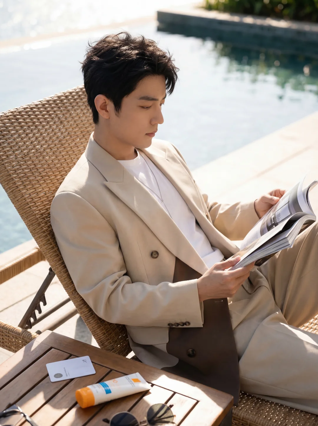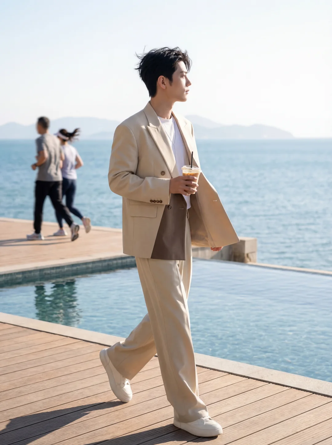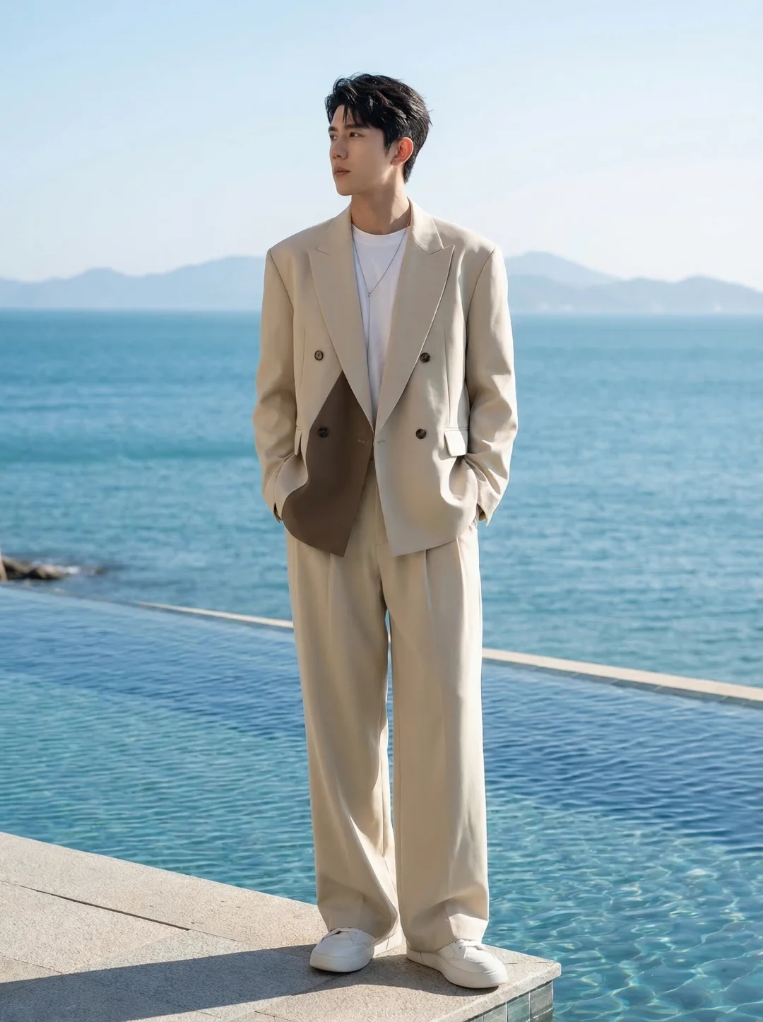 去海边度假最怕搭错衣服。 穿大花衬衫容易显得油腻,穿常规黑西服又像在推销游艇。 上个月去三亚,硬穿了件紧身衬衫,后背汗湿贴在身上贼尴尬。🤦♂️直到我换上这套“米色拼色西服+阔腿裤”的神仙组合。 作为一个[极简穿搭控],这件枪驳领西服直接击中了我。 干净的米白色不仅不吸热,加上腰间那一抹深咖拼接,设计感瞬间拉满。✨内搭直接套一件纯白短袖,面料贴在身上像微风一样轻盈。 哪怕中午顶着大太阳在海边散步,也完全不会觉得闷热粘腻。 下半身的阔腿西裤简直绝了,走在泳池边甚至能感觉到裤管里灌满海风。🌊