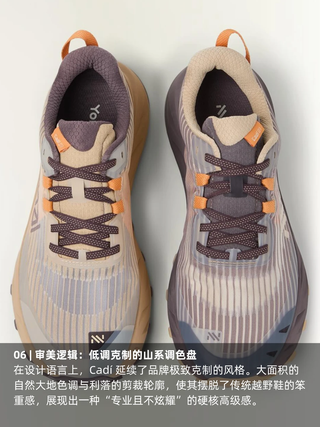 在设计语言上,Cadí 延续了品牌极致克制的风格。大面积的自然大地色调与利落的剪裁轮廓,使其摆脱了传统越野鞋的笨重感,展现出一种“专业且不炫耀”的硬核高级感。