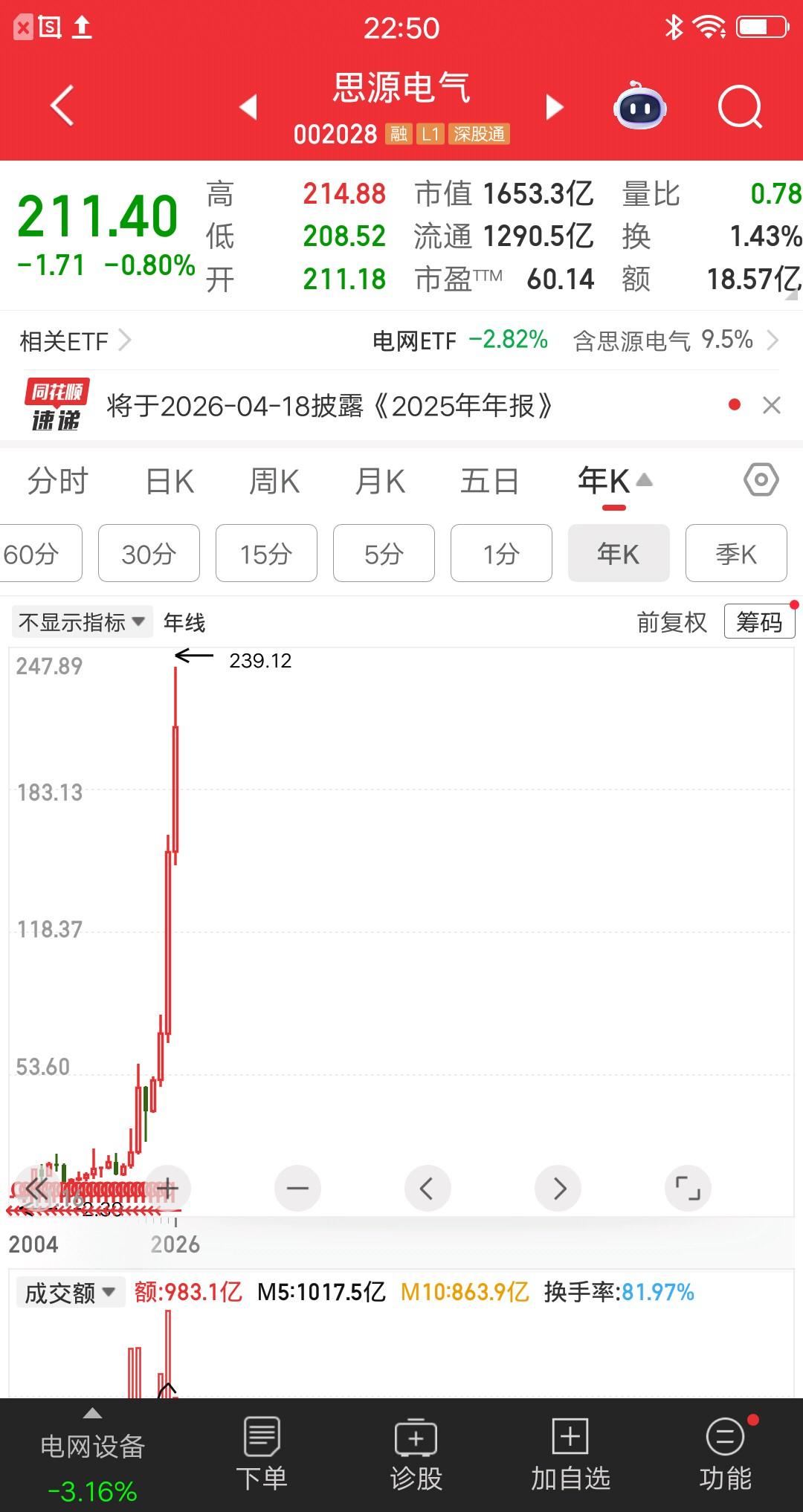 电网设备板块最牛的票诞生了,年线四连阳涨幅五倍多,简直屌爆了!受益于数据中心用电暴增和算电协同,电力和电网设备大爆发。目前电网设备有两只票,市值超过一千亿,分别是国电南瑞2300多亿和思源电气1600多亿。但是从涨幅看思源电气,远远超过国电南瑞,所以思源电气是电网设备板块最牛的票,应该非常合理吧。 估计会有一直持股没卖的人,现在赚翻了,真让人羡慕嫉妒恨呀! 当然现在股价在历史高位了,别追高,小心套在山顶,瑟瑟发抖呀!