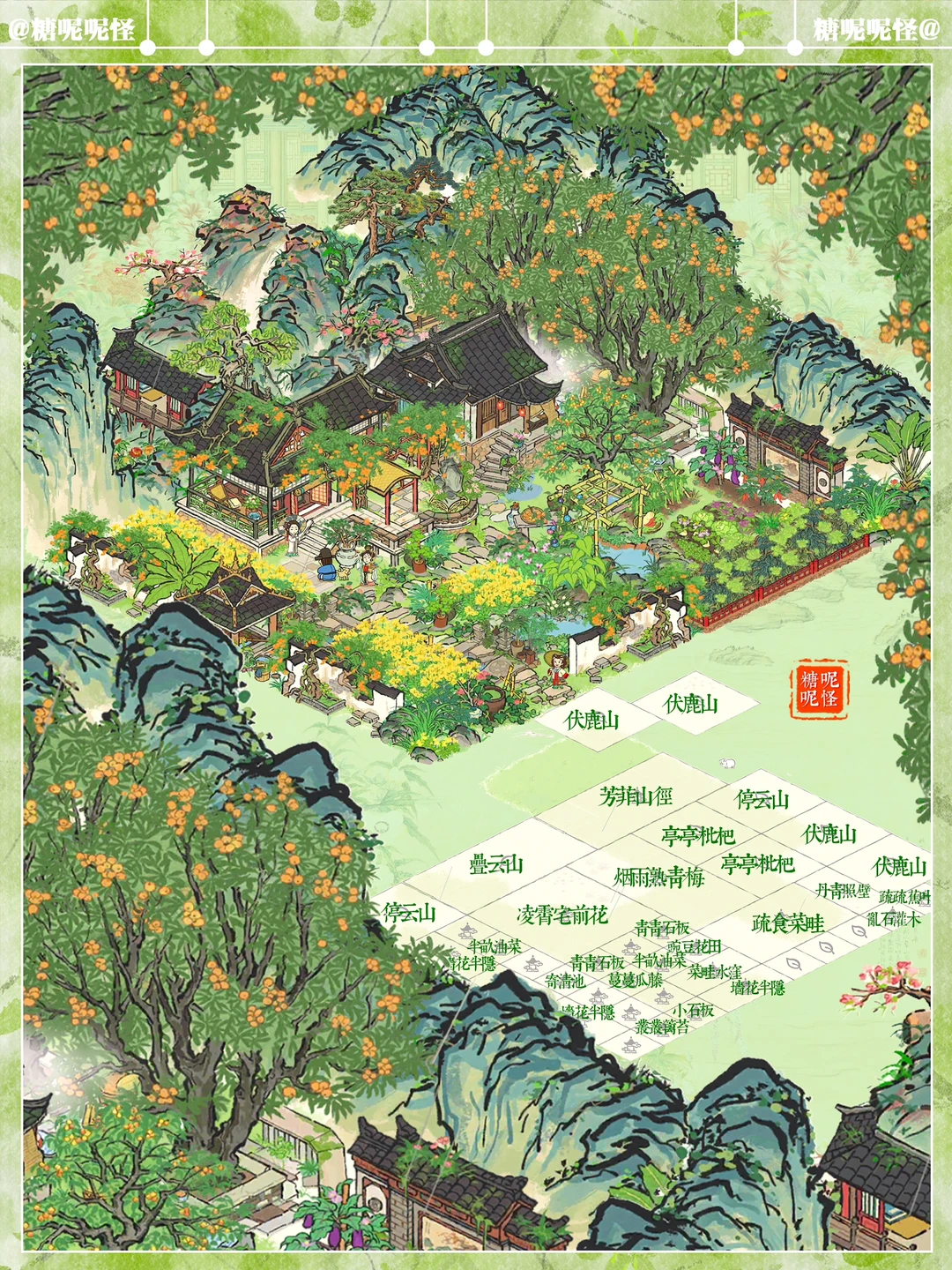 建筑:凌霄宅前花|烟雨熟青梅|亭亭枇杷|叠云山|疏食菜畦|芳菲山径|停云山|伏鹿山|墙花半隐|亭井|丛丛篱苔|青青石板|疏疏蕉叶|乱石灌木|蔓蔓瓜藤|半亩油菜|豌豆花田|小石板