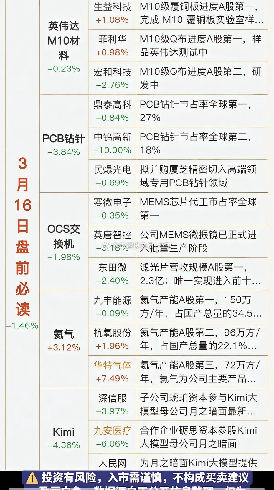 3.16周一 盘前 财经热点必读!1.英伟达M10材料,覆铜板2.PCB钻针3.OCS交换机4.氦气供应紧张5.百模大战KIMI,估值增加