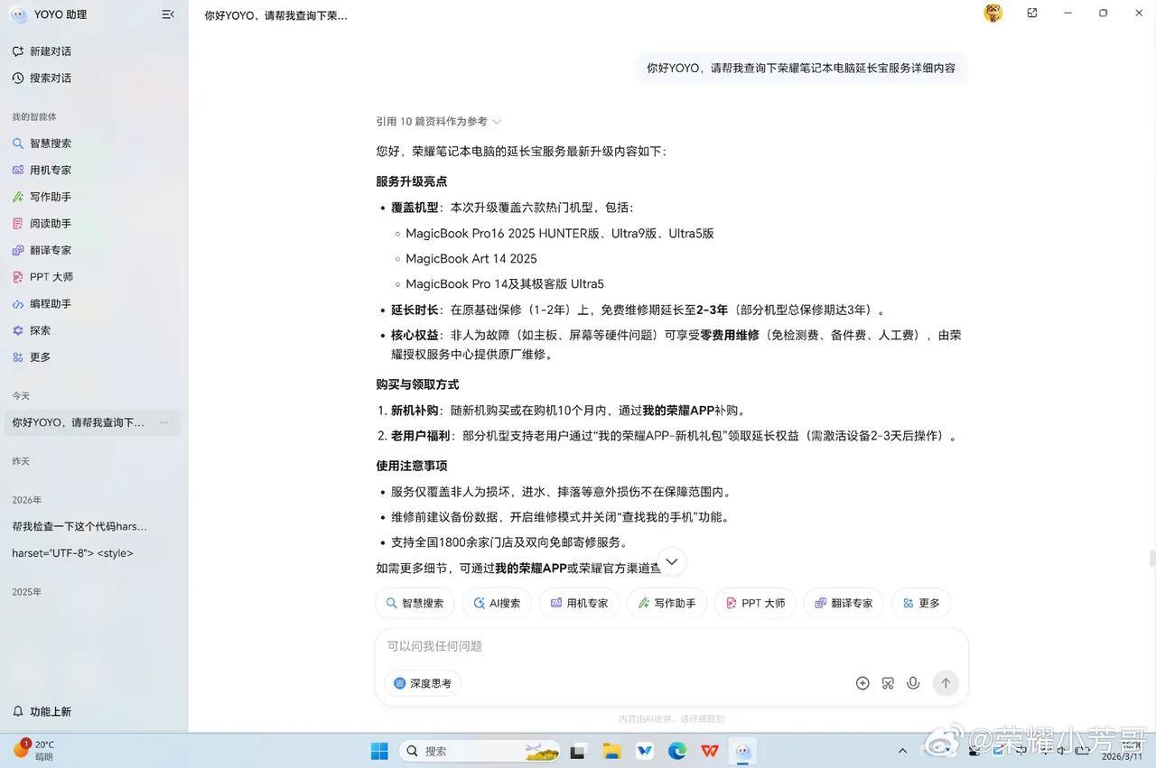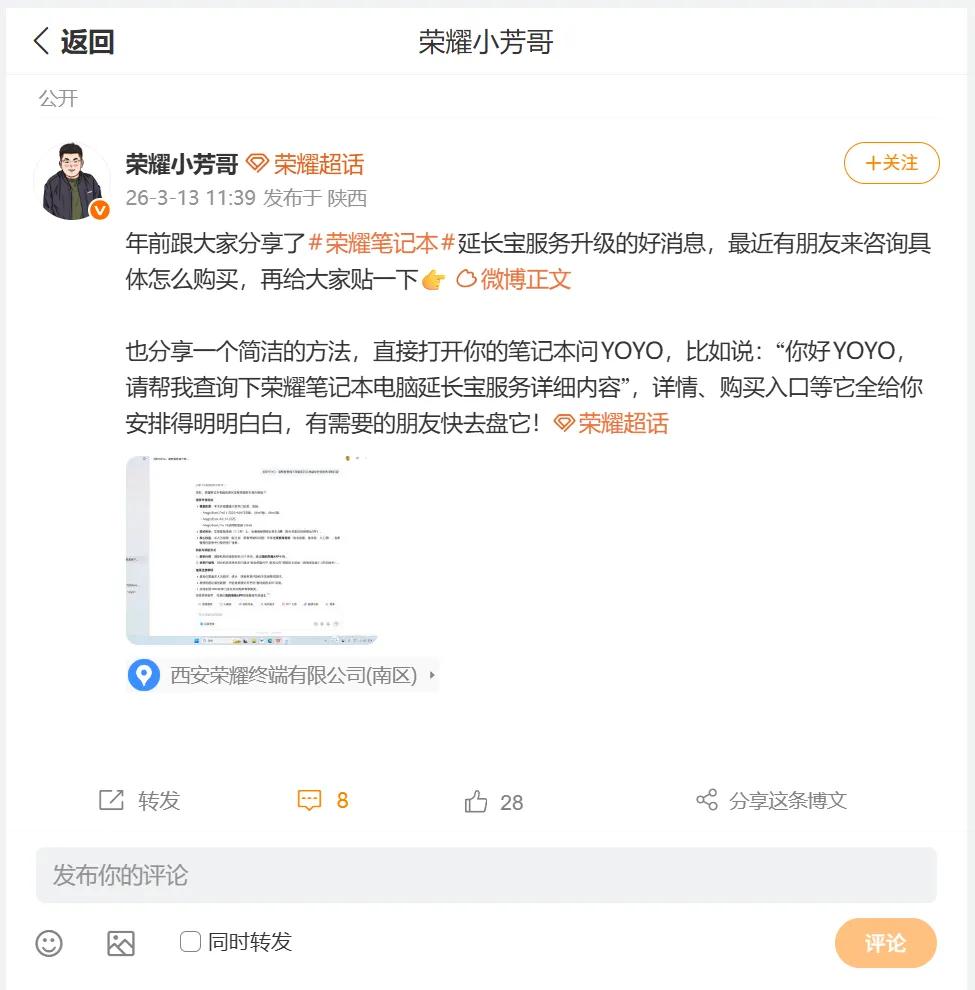 跟荣耀YOYO说一句话,查询荣耀当前手机/笔记本延长宝政策,YOYO给出很详细方案,给用户省下很多时间去找。还能根据你的需求跳到到荣耀商城购买延长宝。 安排很明明白白。 荣耀使用小技巧 MagicOS月月新