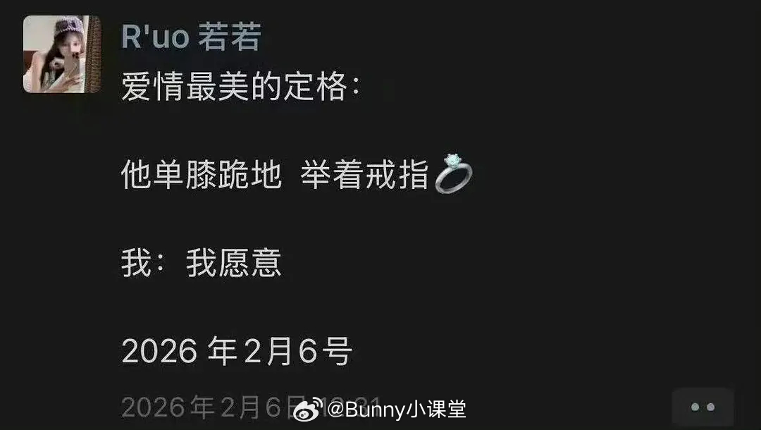 网传若若在2月6日置顶求婚朋友圈,当天田栩宁代言品牌被粉丝买爆;2月14号田栩宁情人节营业,2月15号若若晒钻戒和手镯……太刺激了
