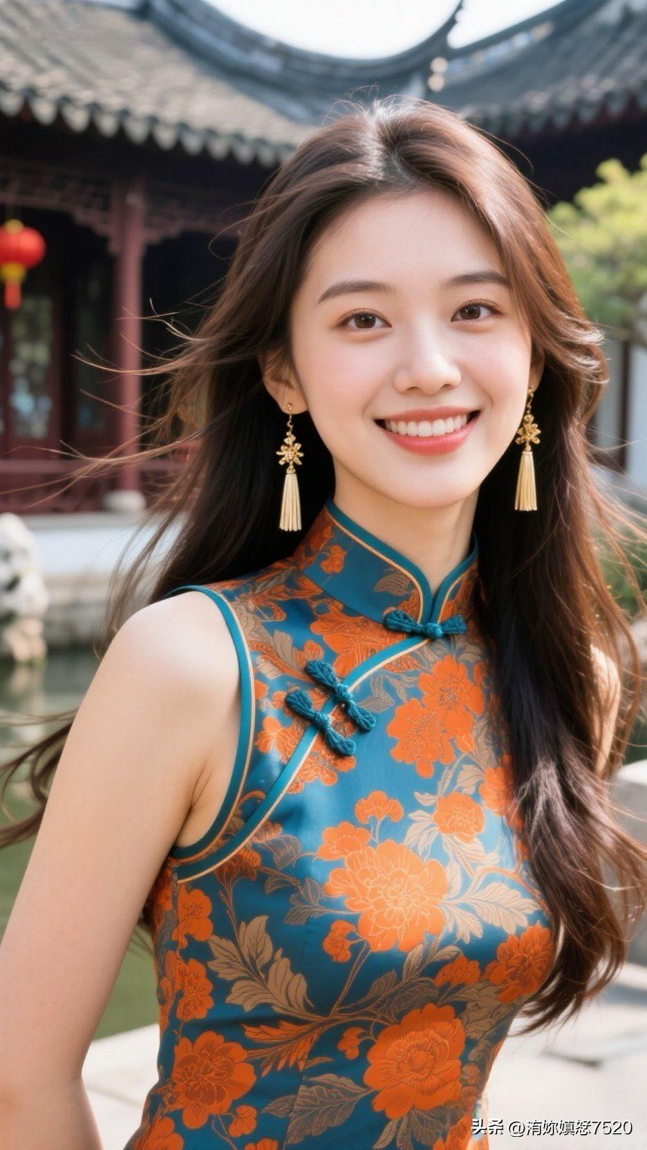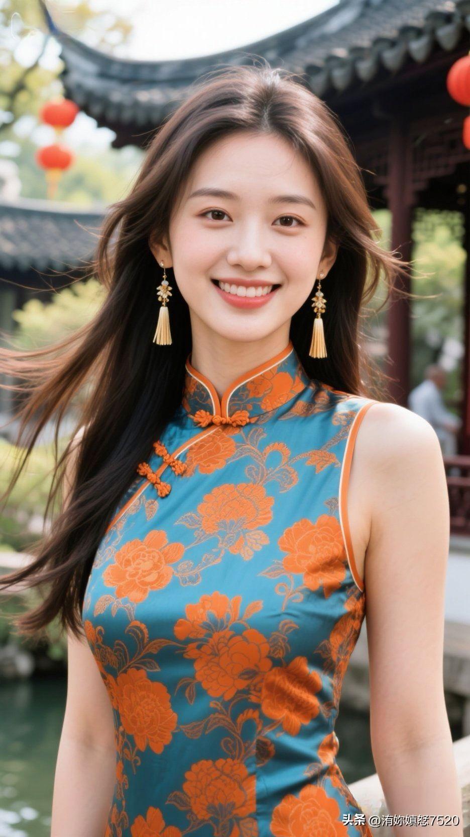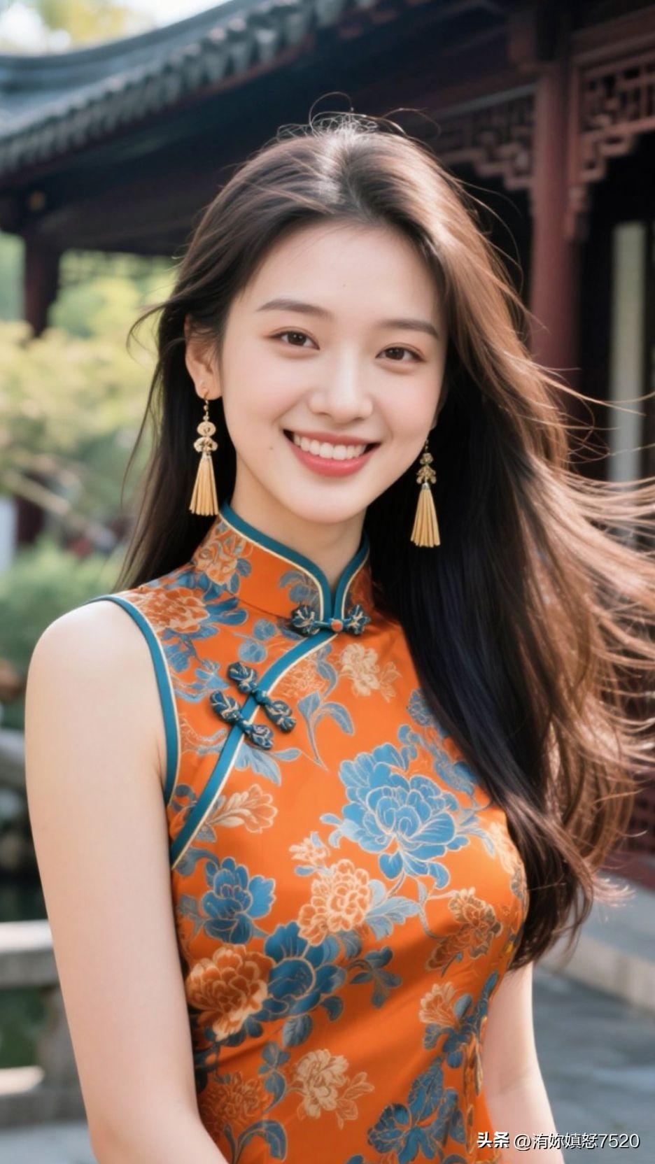 🍊 暖橙缎面盛着晴日的光,蓝宝坠成颈间的星,笑意漫开时,整个空间都浸着鲜活的甜