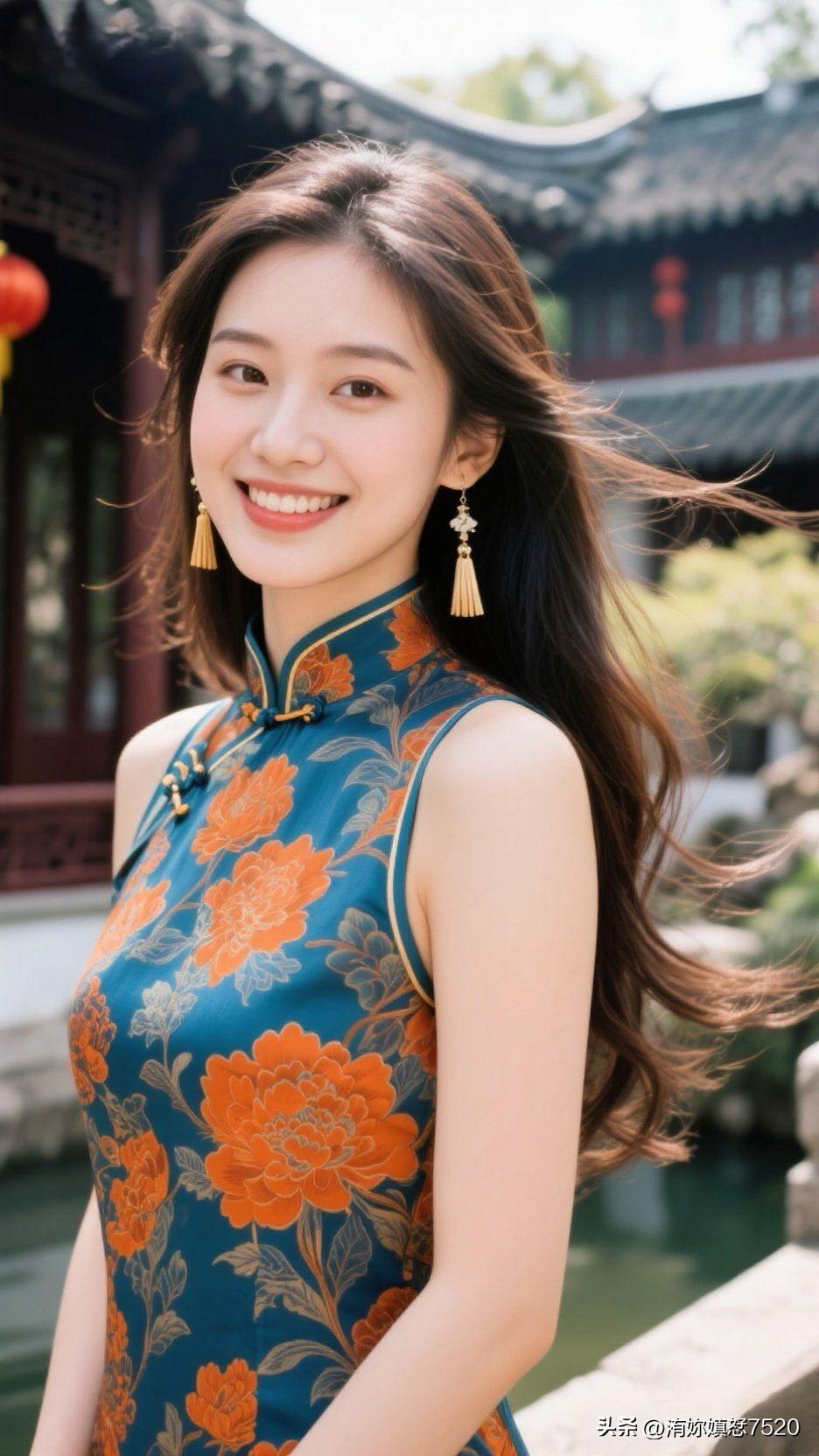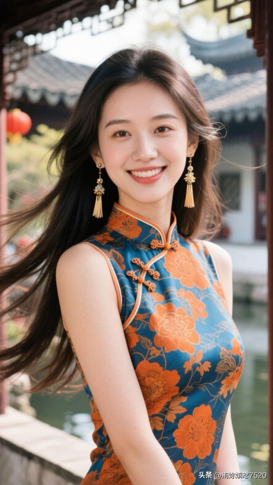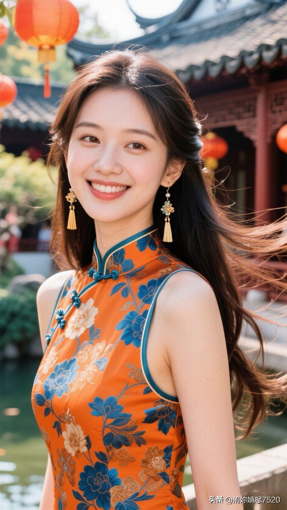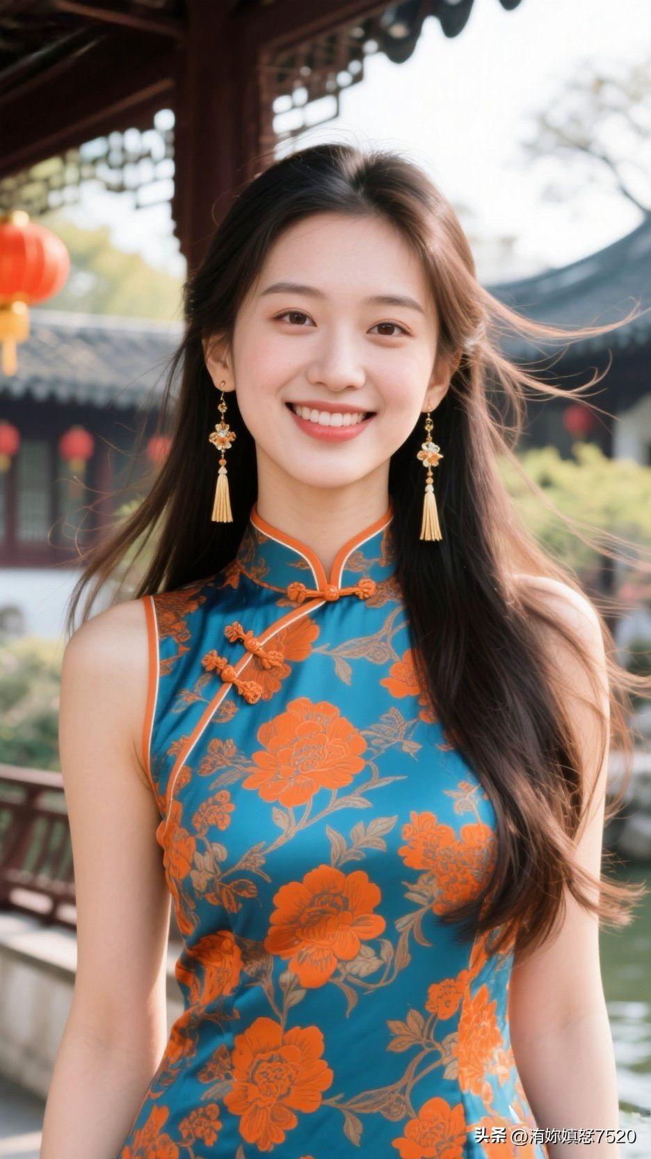 🍊 暖橙缎面盛着晴日的光,蓝宝坠成颈间的星,笑意漫开时,整个空间都浸着鲜活的甜
