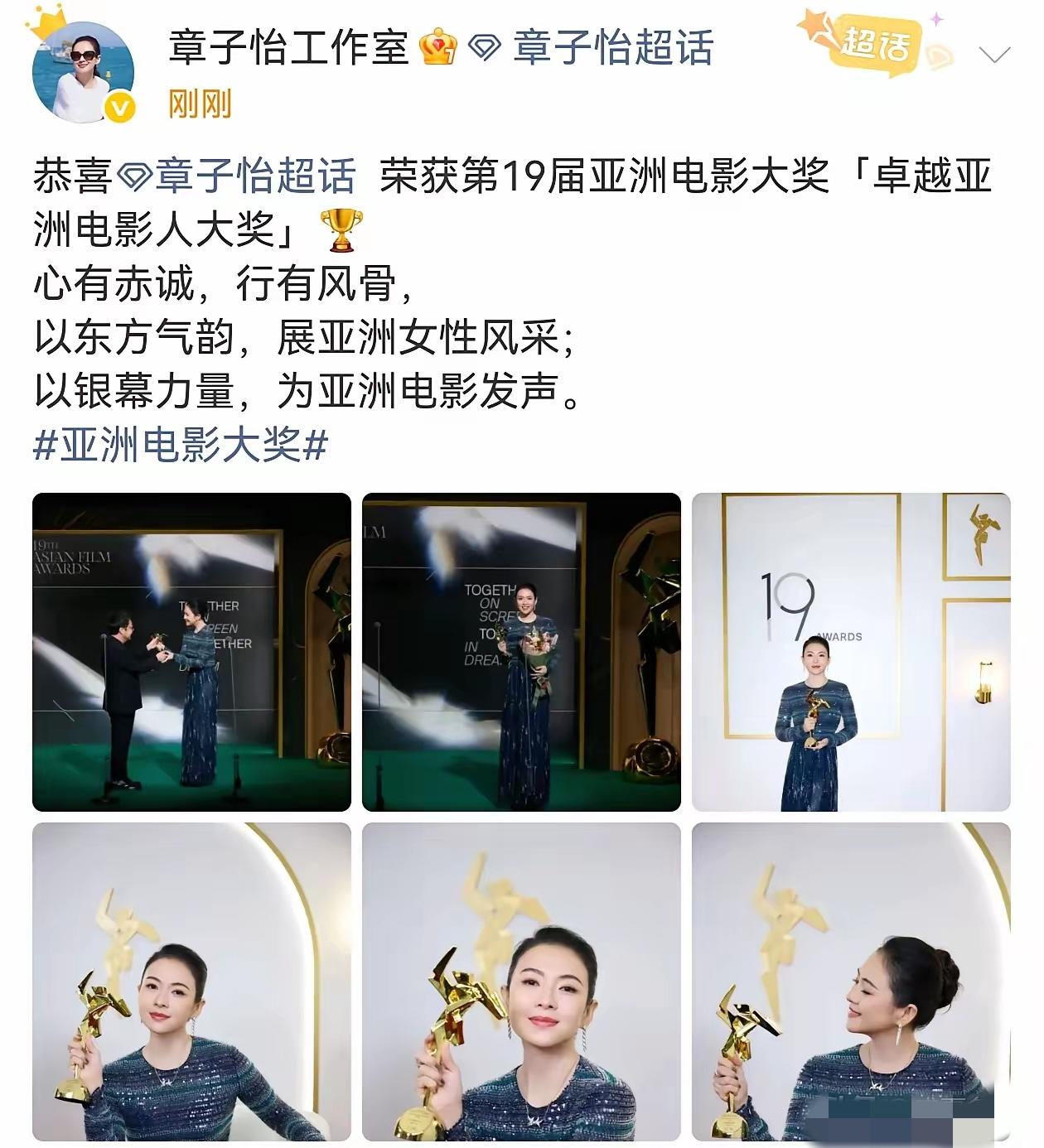 恭喜!章子怡再次获奖! 3月15日,章子怡工作室在社交平台分享她的照片,并配文:恭喜章子怡荣获第19届亚洲大奖,《卓越亚洲电影人大奖》 照片中的章子怡,身穿条纹体恤,下搭同色裙子,盘发造型,手里拿着奖,笑容甜美,美的360℃无死角,章子怡真是越来越优秀了!