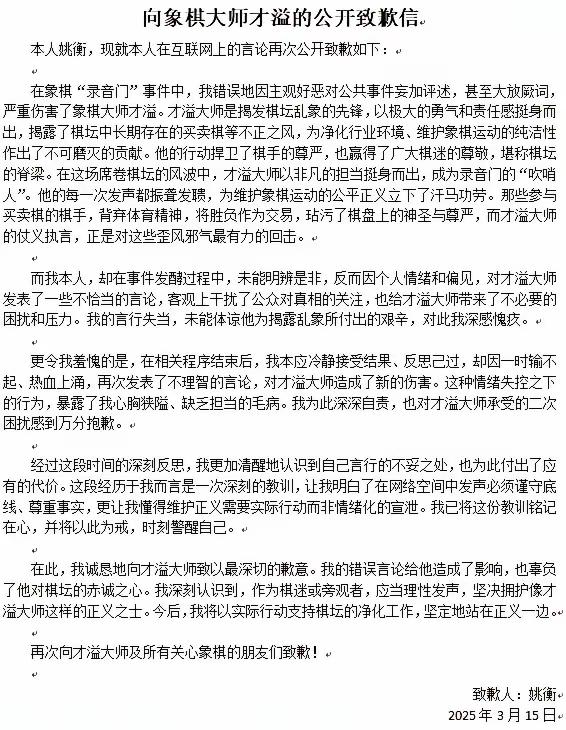小y再次道歉。 这次道歉和上次道歉不一样,这次道歉和上次的道歉有根本的认知转变。 有没有道歉的诚意不作评价,但道歉是认真的! 一个在读博士,明辨是非的能力应该有。 想评棋就继续评棋,作为业余爱好,也很好。象棋录音门