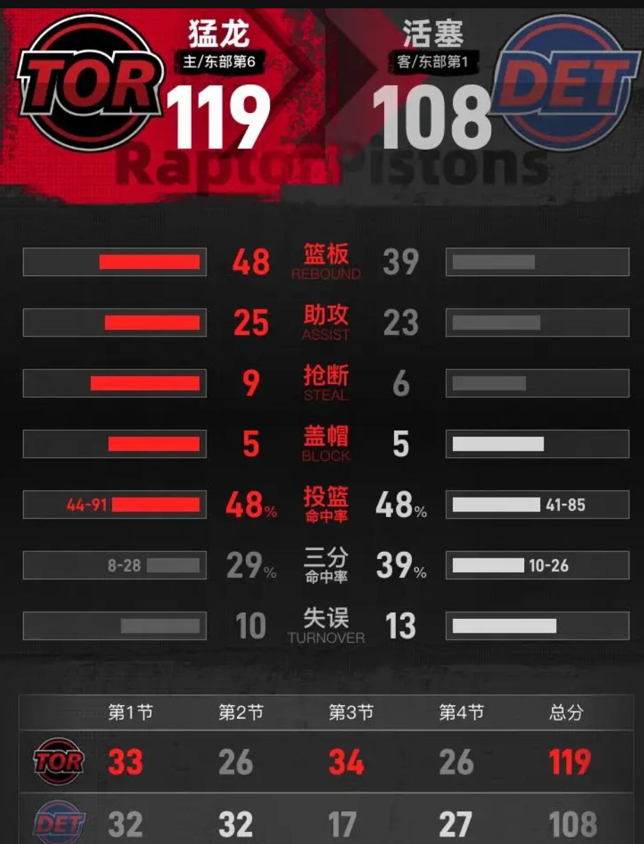 119-108,坎宁安空砍33分9助攻?错了,这场球他才是唯一的战士。 看完第三节你就知道,这不是"数据刷子"的表演,是23岁的坎宁安一个人在扛着整艘船过暗礁。上半场活塞命中率64.9%,看着像要屠杀,第三节突然掉到26.9%——这不是坎宁安的问题,是除了他,没人知道该怎么在压力下呼吸。 最戳心的是那个对比:27岁的英格拉姆34分轻松写意,24岁的巴雷特27分游刃有余,他们身后是30岁的珀尔特尔21分18篮板的定海神针。猛龙五首发全上双,全队30次助攻,这就是团队篮球的样子。而坎宁安这边,33分9助攻,而球队只有21次助攻,他在弧顶呼叫战术时,队友眼神里的茫然藏不住。 46岁的拉贾科维奇在场边嚼着口香糖,他知道自己的球队赢在"均衡"——英格拉姆硬解,珀尔特尔护筐,巴恩斯(23岁)本赛季第100次盖帽成为队史第五人。而活塞这边,57岁的比克斯塔夫手里除了坎宁安和杜伦(21岁),牌确实少了点。 这也正是治愈的地方。坎宁安第三节被包夹时,分球给哈里斯,给杜伦,哪怕他们投不进——这种信任比赢球更重要。23岁的他不再是那个只懂单打的少年,他在学习怎么让队友变得更好,哪怕过程很疼。 真正的认知是:这不是坎宁安的问题,是成长的代价。英格拉姆34分背后有珀尔特尔的18个篮板,坎宁安33分背后只有自己的影子。这不丢人,这是重建路上的必经之痛。给坎宁安一个珀尔特尔式的支柱,他也能带出119分的团队胜利。 这场球不是给坎宁安的耳光,是写给活塞管理层的一封信——别让战士孤军奋战太久,时间不等人。坎宁安空砍33分英格拉姆34分 活塞不敌猛龙