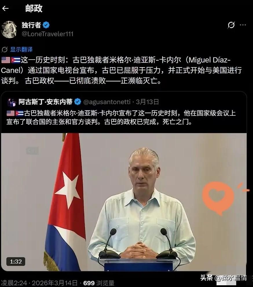 古巴已经顶不住了,总统卡内尔通过国家电视台宣布,屈服于美国压力要求,已经和美国进行谈判,并同意美国FBI进入调查(快艇事件调查) 这话听着扎心,可你得看清楚——卡内尔说的不是“投降”,是“谈判” 。3月13日,他在电视讲话里承认:古巴官员近日与美国政府代表谈了,目的就一个——通过对话解决两国之间的分歧 。这不是跪,是换条路站着。 可这话从古巴人嘴里说出来,比刀割还疼。美国国务卿鲁比奥早就把调子定了:对古巴的“友好接管”只是时间问题 。特朗普那边更狠——1月刚把委内瑞拉总统马杜罗抓了 ,古巴最大的靠山倒了;石油封锁压下来,过去三个月一滴燃料都没进古巴 。 快艇的事得说清楚。2月25号凌晨,一艘注册在佛罗里达的快艇,载着10个武装人员,带着13000多发弹药,往古巴北海岸闯 。古巴巡逻艇上去查,对方从185米外就开枪,把古巴艇长打伤了。交火到最后,4死6伤 。被捕的人全是在美国的古巴公民,多数有犯罪记录 。 卡内尔说FBI会来古巴,跟内务部一起查 。这话什么意思?意思是主权上开了个口子。可你再品品——古巴同时宣布,在梵蒂冈斡旋下释放51名囚犯 。一边让步,一边递橄榄枝,这是被逼到墙角了还在挣扎。 最惨的不是谈判,是谈判桌上那张账单。美国制裁60多年,古巴经济本来就半死不活。现在能源危机直接要命——约60%的能源短缺,成千上万古巴人因缺电无法手术 。美国驻古巴大使馆都只安排一半人上班,发电机每天只敢用四小时 。使馆都这样,老百姓呢? 卡内尔说了句实话:这些对话“非常敏感”,必须在“两国平等和尊重彼此政治制度的基础上进行” 。可问题是,你家门口站着个巨人,你跟他谈平等,他听吗? 现在回头看那句“顶不住了”,其实只说对了一半。古巴确实顶不住经济封锁,顶不住石油断供,顶不住60多年的制裁。可他们没顶不住的是——还在谈,还在熬,还在想办法。让FBI进来查案,不是投降,是换条路走。小国的尊严,有时候就是喘口气的功夫。 各位读者你们怎么看?欢迎在评论区讨论。 古巴地图